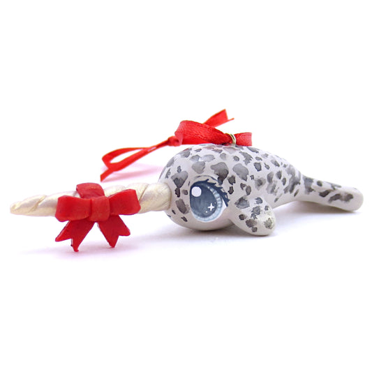 Bow Narwhal Ornament with Blue Eyes - Polymer Clay Christmas Animals