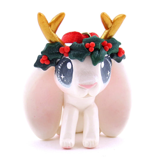 Holly Crown White Jackalope Ornament - Polymer Clay Christmas Animals