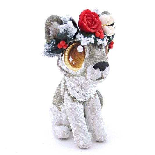 Grey Wolf with Winter Flower Crown Figurine - Polymer Clay Christmas Animals