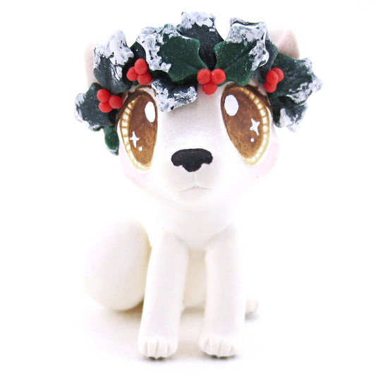 Arctic White Wolf with Holly Crown Figurine - Polymer Clay Christmas Animals