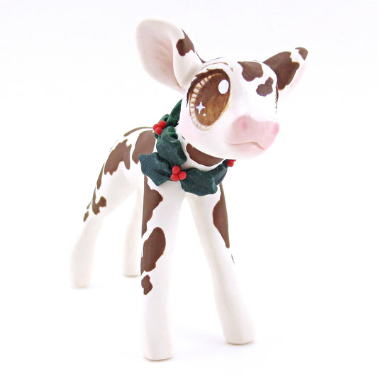 Brown Holstein Cow with Holly Wreath Figurine - Polymer Clay Christmas Animals