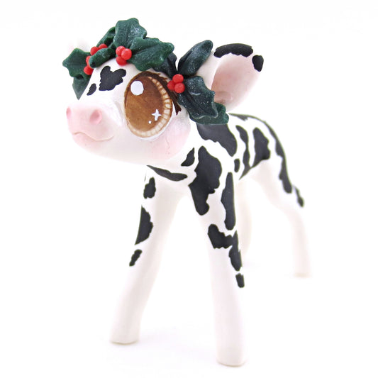 Black Holstein Cow with Holly Crown Figurine - Polymer Clay Christmas Animals