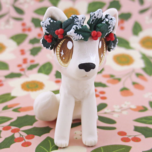 Arctic Fox with Holly Crown Figurine - Polymer Clay Christmas Animals