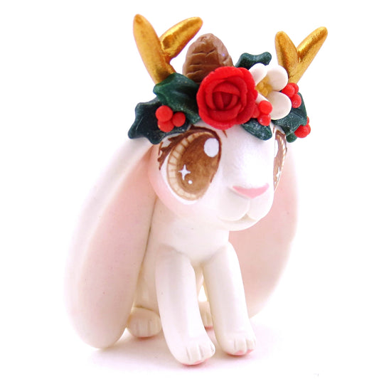 White Christmas Flower Crown Jackalope Bunny Figurine - Polymer Clay Christmas Animals
