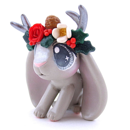 Grey Christmas Flower Crown Jackalope Bunny Figurine - Polymer Clay Christmas Animals