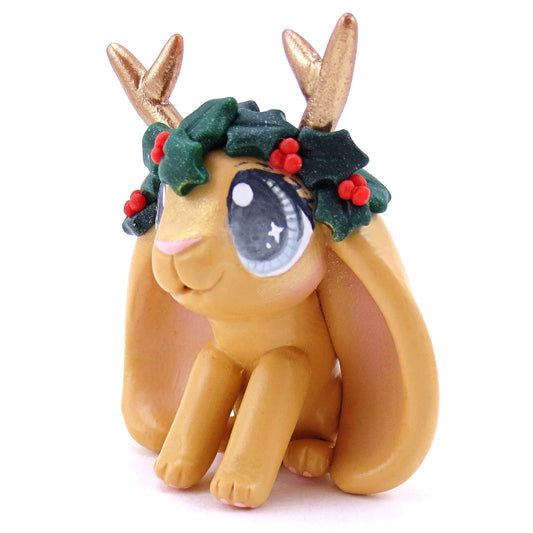 Ginger Orange Holly Crown Jackalope Bunny Figurine - Polymer Clay Christmas Animals
