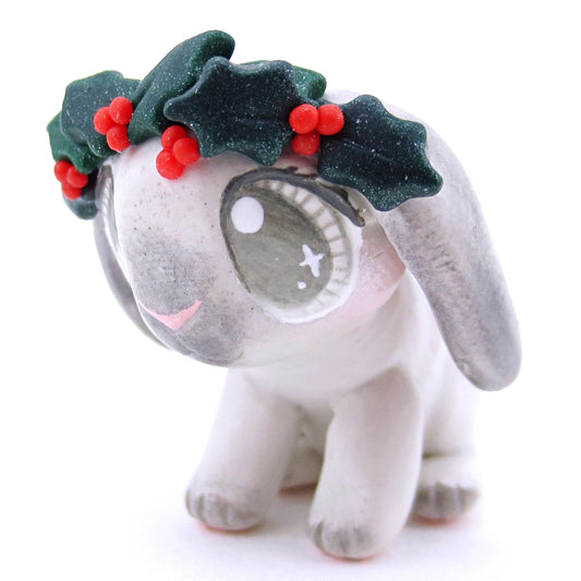 Holly Crown Grey Holland Lop Bunny Figurine - Polymer Clay Christmas Animals