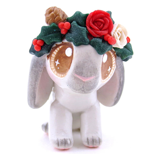 Christmas Flower Crown Grey Holland Lop Bunny Figurine - Polymer Clay Christmas Animals