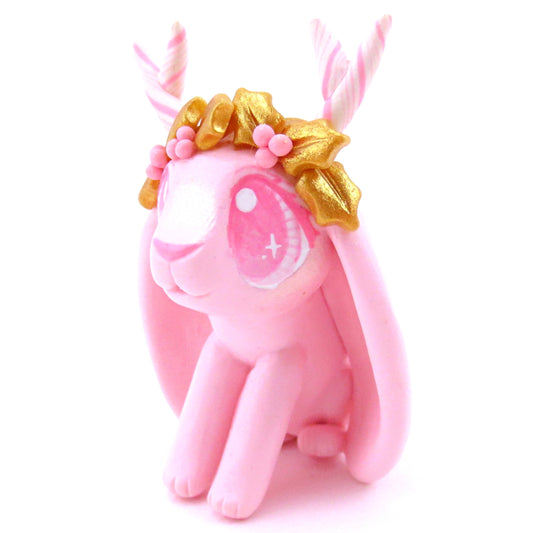 Pink Christmas and Gold Holly Jackalope Bunny Figurine - Polymer Clay Christmas Animals