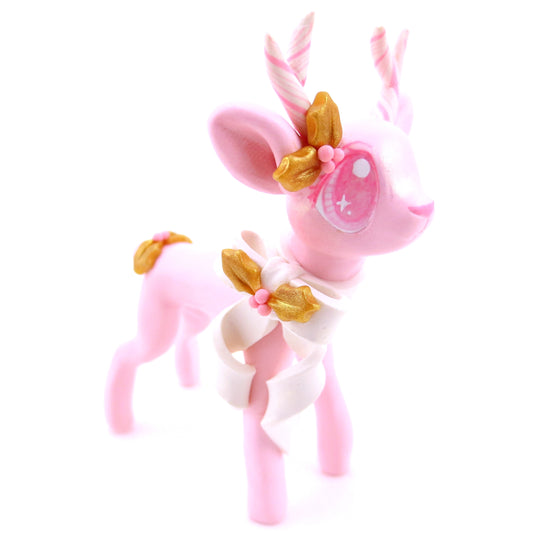 Pink Christmas Gold Holly Reindeer Figurine - Polymer Clay Christmas Animals