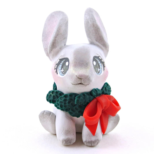 Christmas Wreath Grey Bunny Figurine - Polymer Clay Christmas Collection