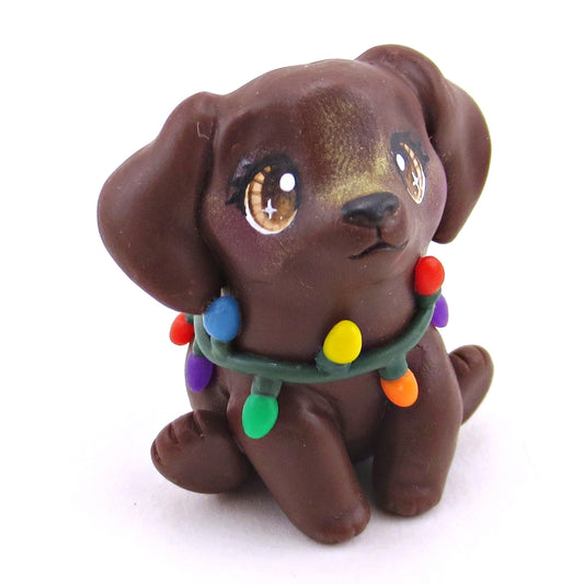 Christmas Lights Chocolate Lab Puppy Dog Figurine - Polymer Clay Christmas Collection