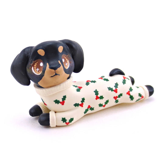 Christmas Jammies Black and Tan Dachshund Puppy Dog Figurine - Polymer Clay Christmas Collection