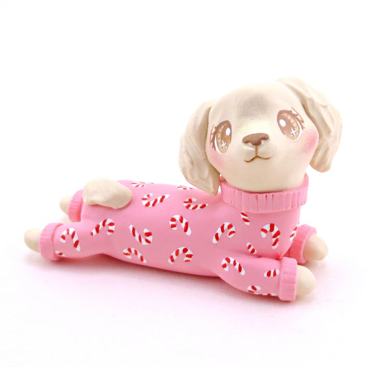 Candy Cane Christmas Jammies Cream Dachshund Puppy Dog Figurine - Polymer Clay Christmas Collection
