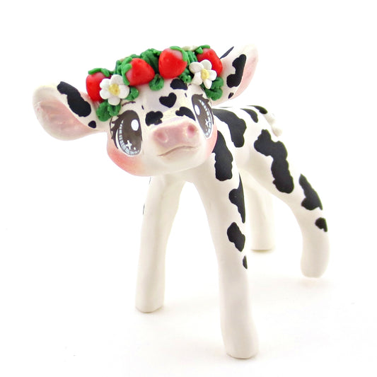 Black Spotted Strawberry Crown Holstein Cow Figurine - Polymer Clay Cottagecore Spring Animal Collection