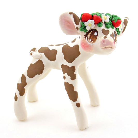 Brown Spotted Strawberry Crown Holstein Cow Figurine - Polymer Clay Cottagecore Spring Animal Collection