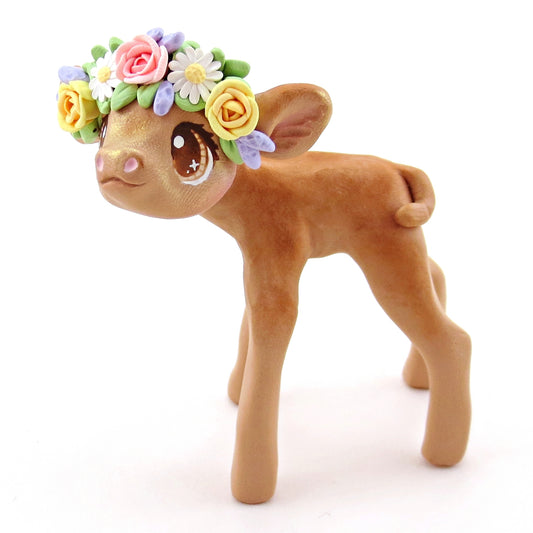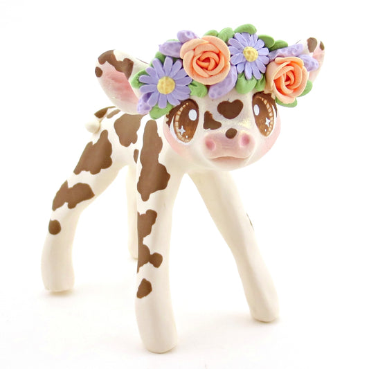 Spring Flower Crown Jersey Brown Cow Figurine - Polymer Clay Cottagecore Spring Animal Collection