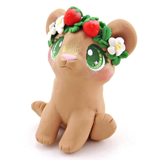 Strawberry Crown Bear Cub Figurine - Polymer Clay Cottagecore Spring Animal Collection