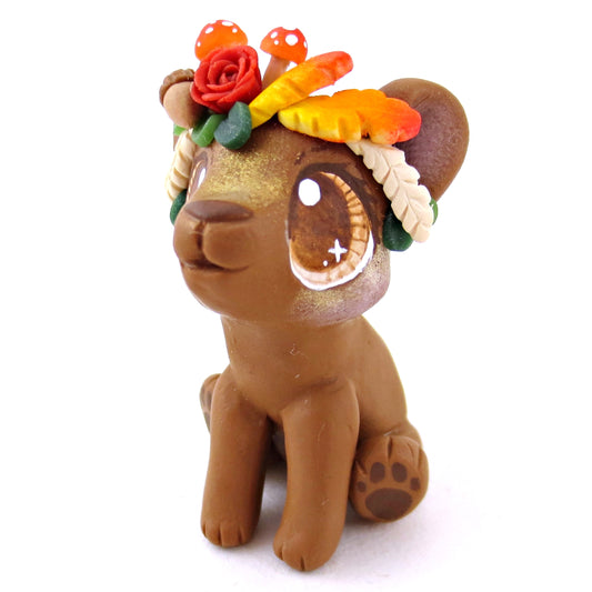 Fall Flower Crown Brown Bear Figurine - Polymer Clay Fall Animals
