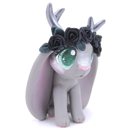Black Rose Crown Grey Jackalope Figurine - Polymer Clay Animals