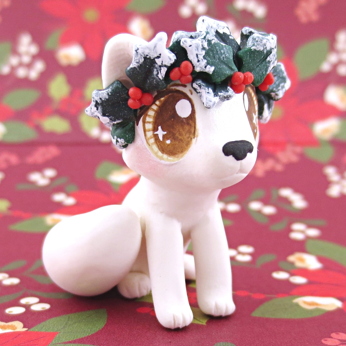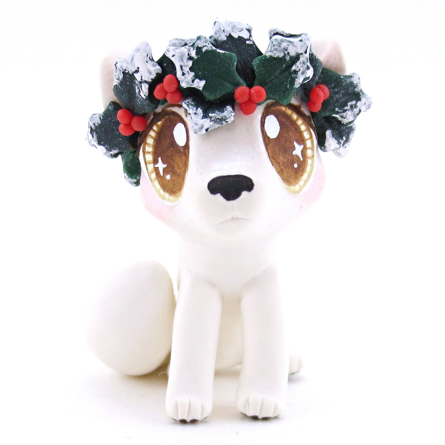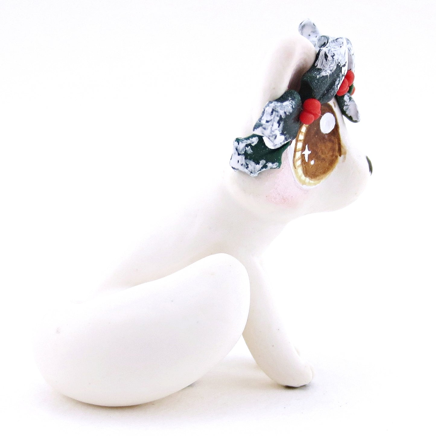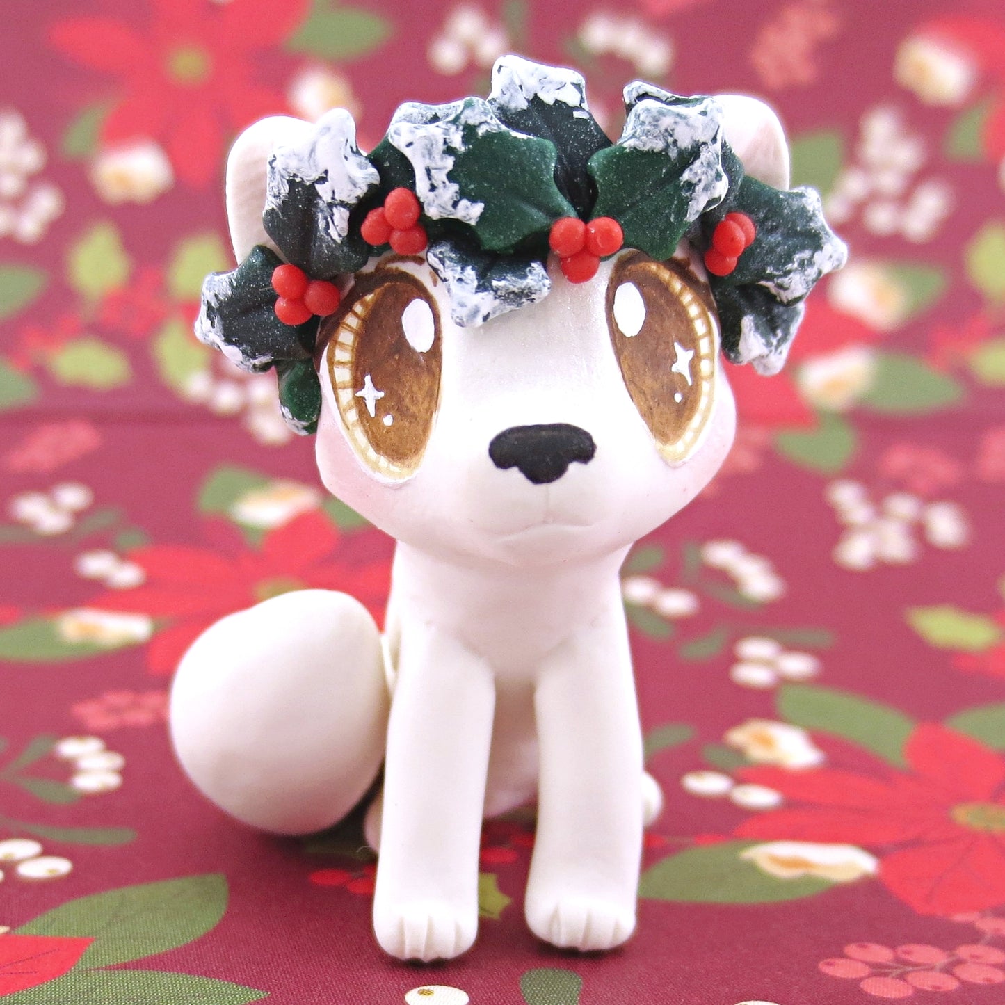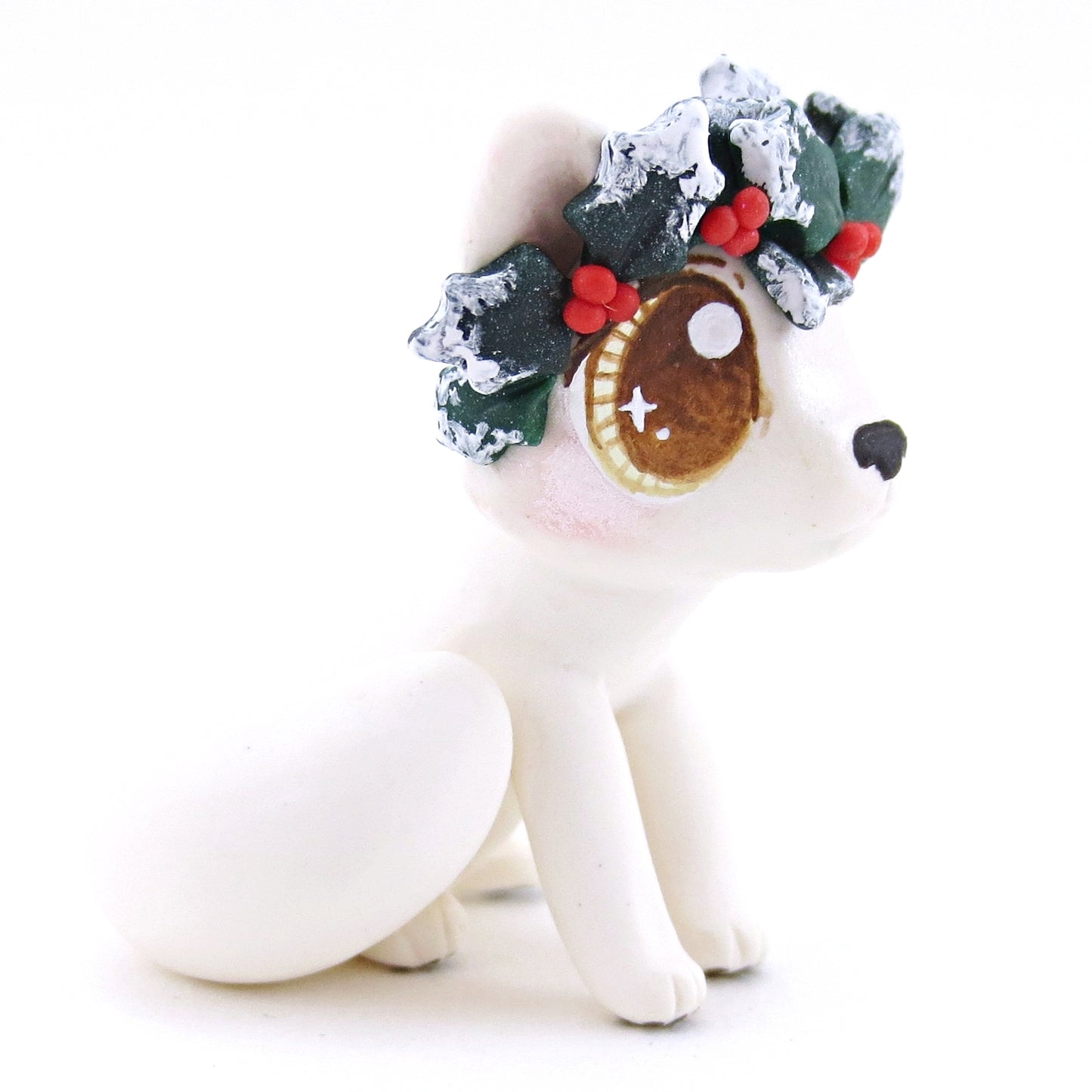 Arctic Fox with Holly Crown Figurine - Polymer Clay Christmas Animals
