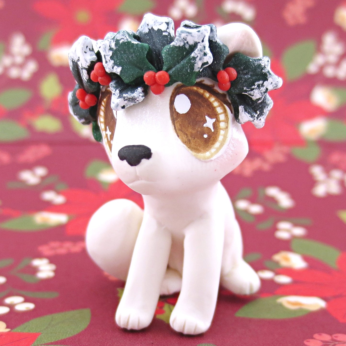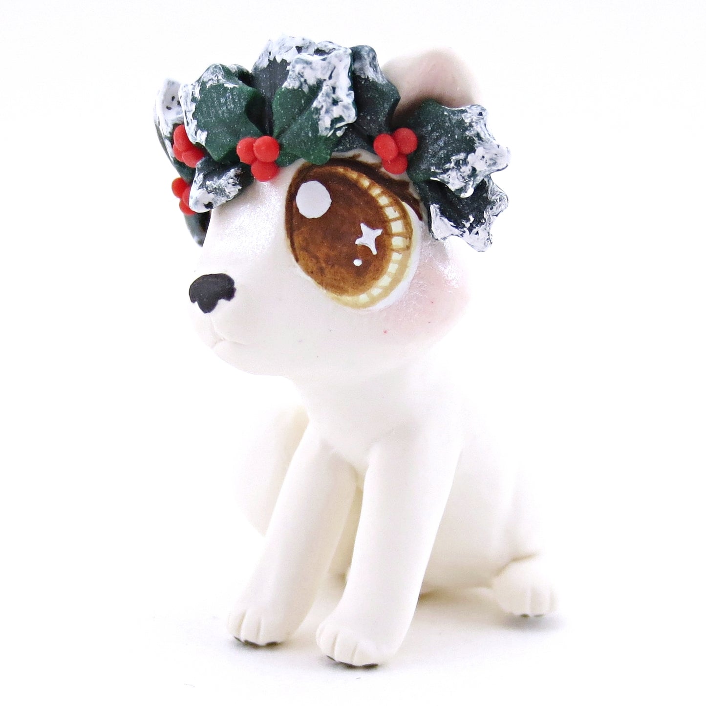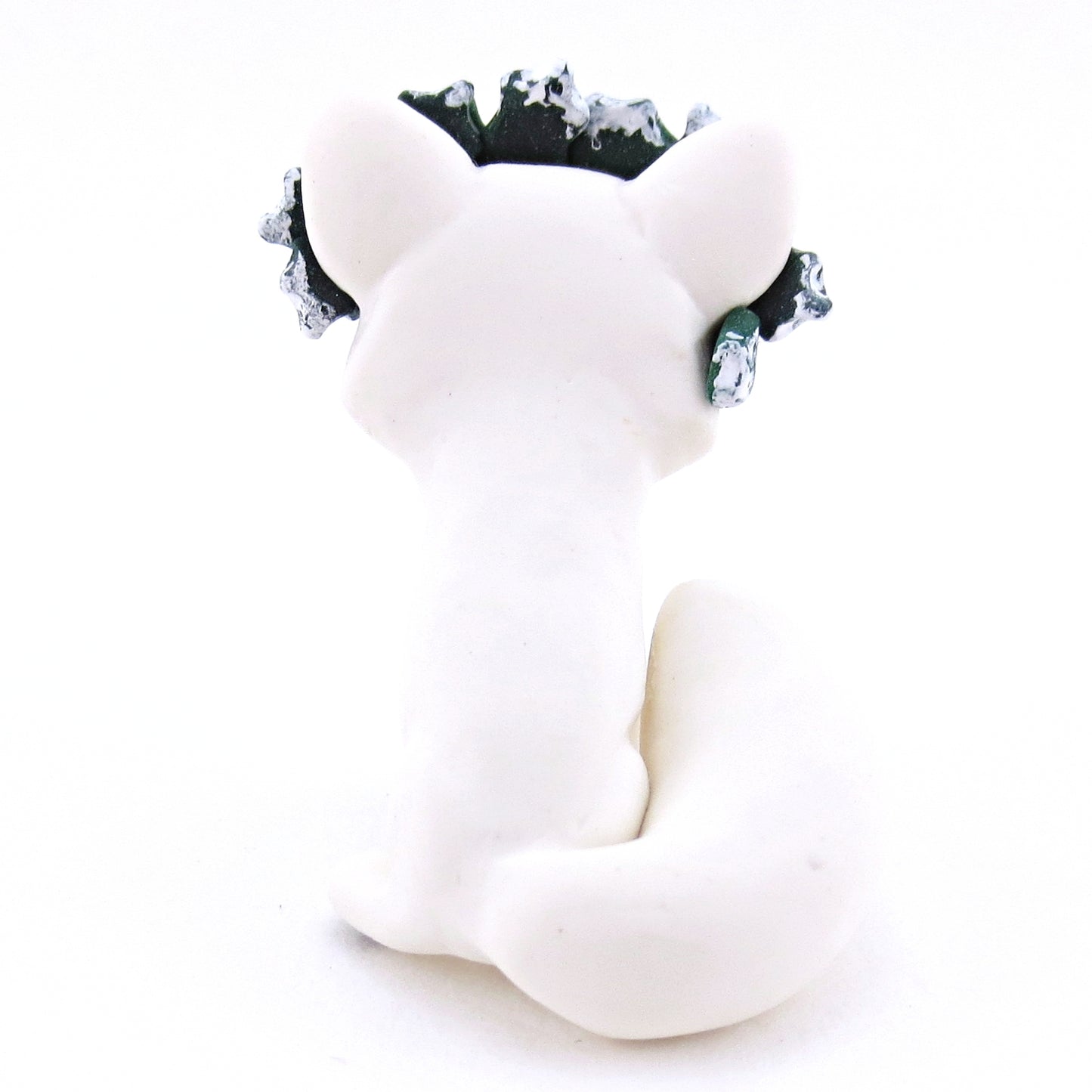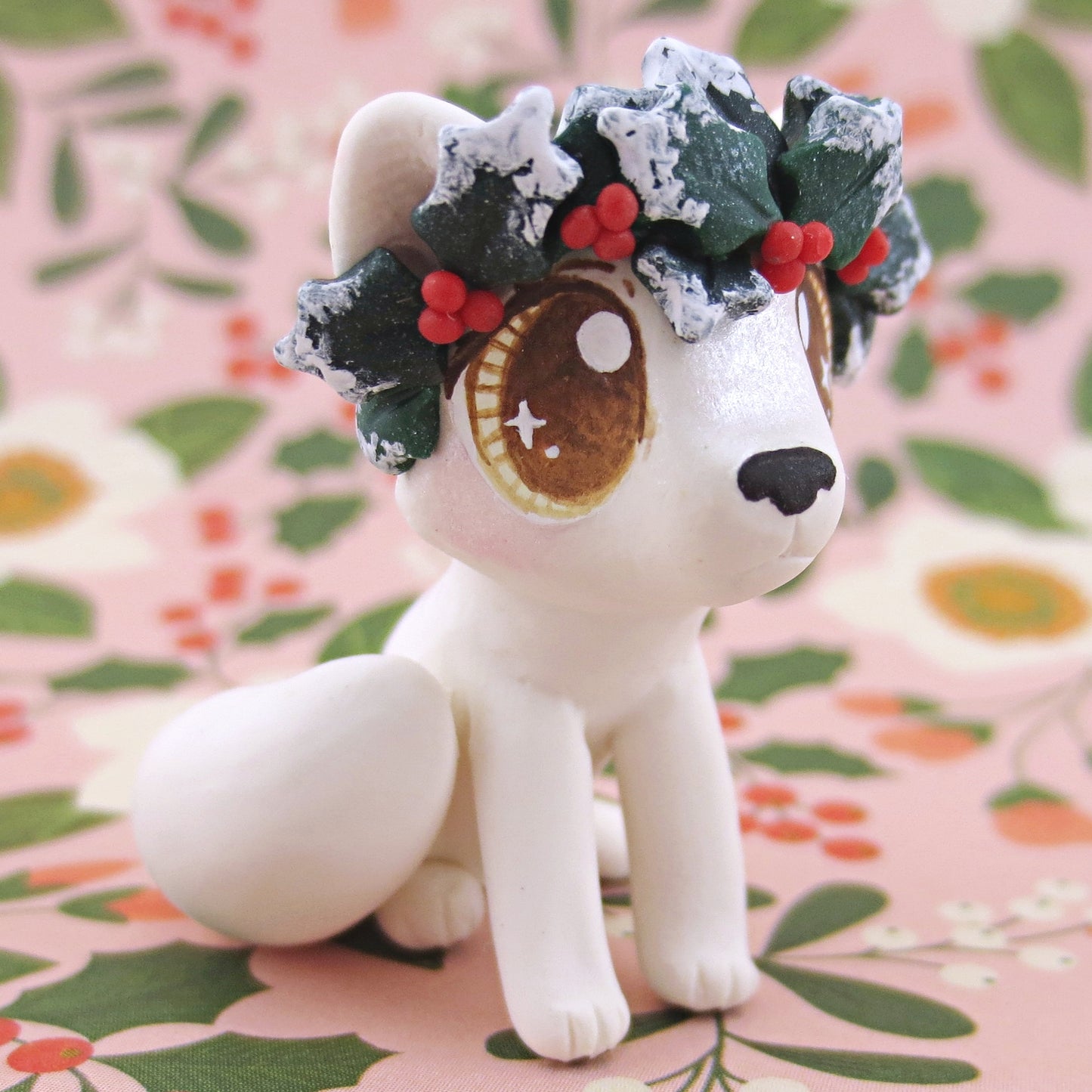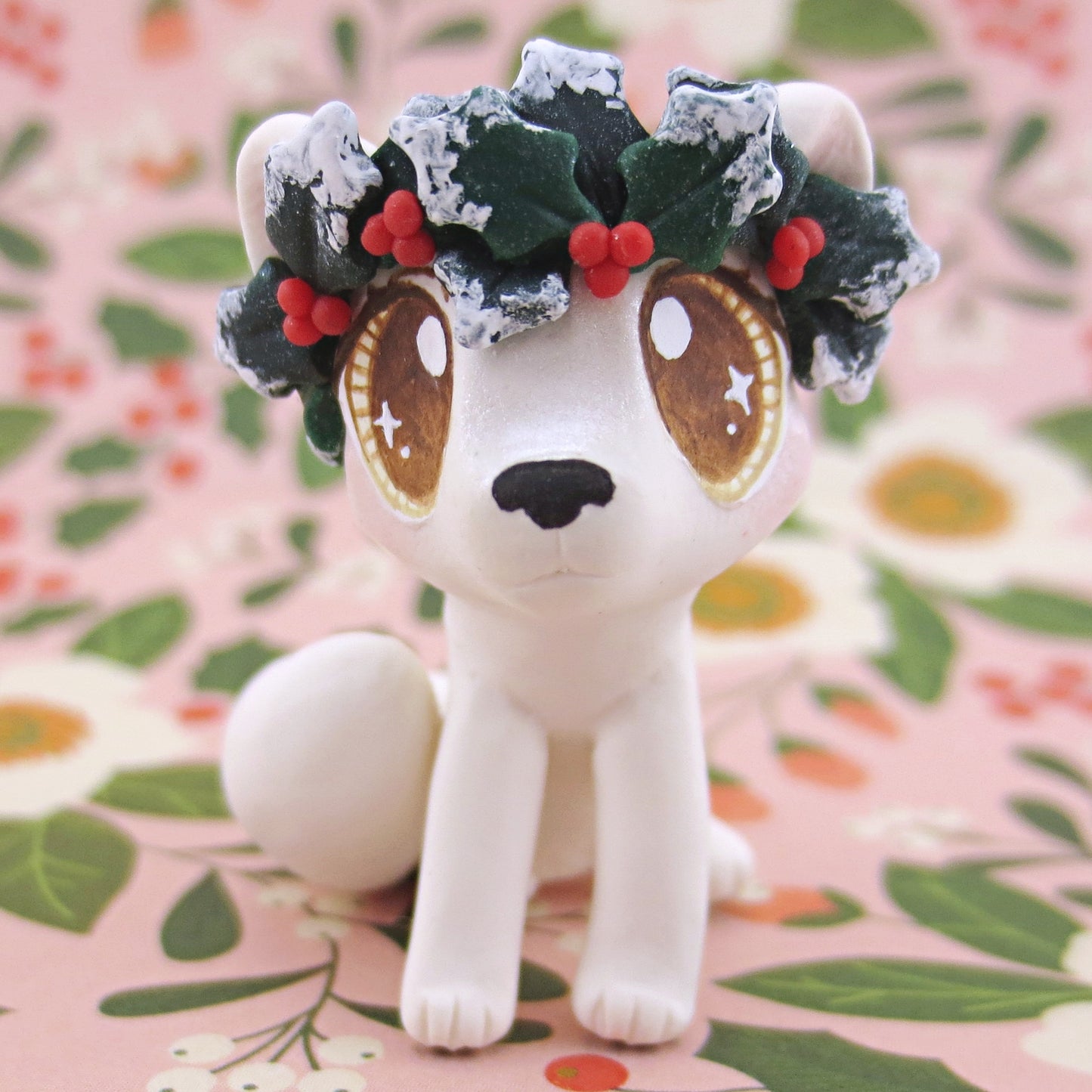 Arctic Fox with Holly Crown Figurine - Polymer Clay Christmas Animals
