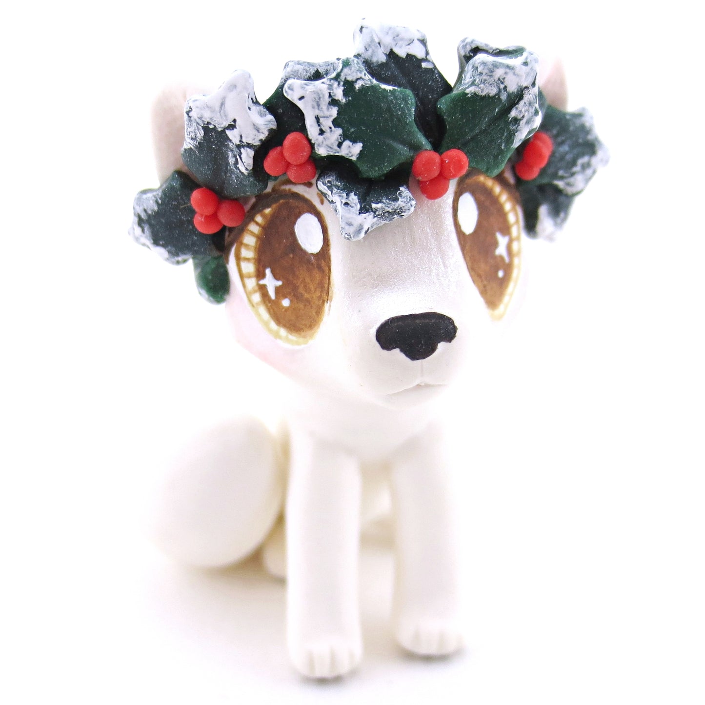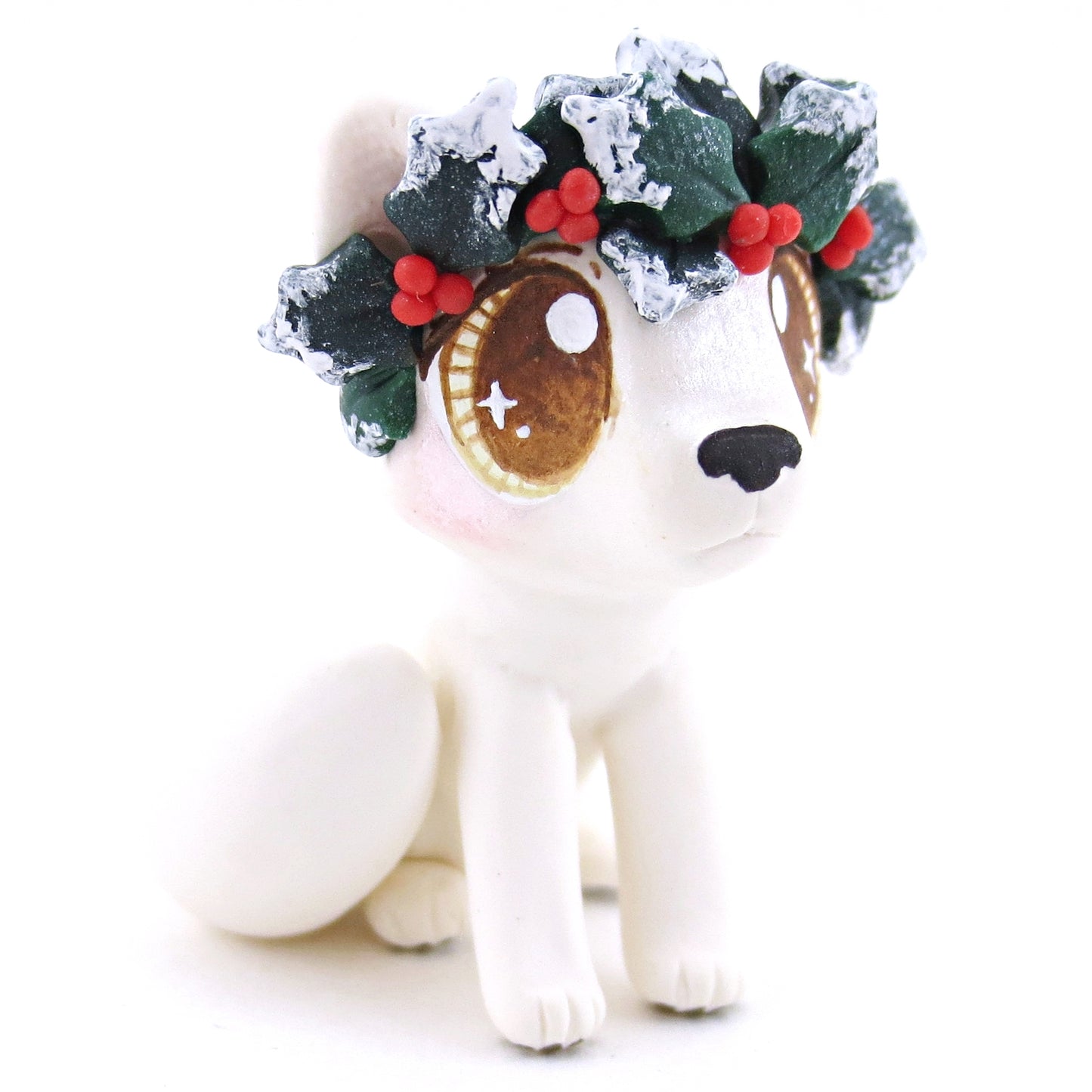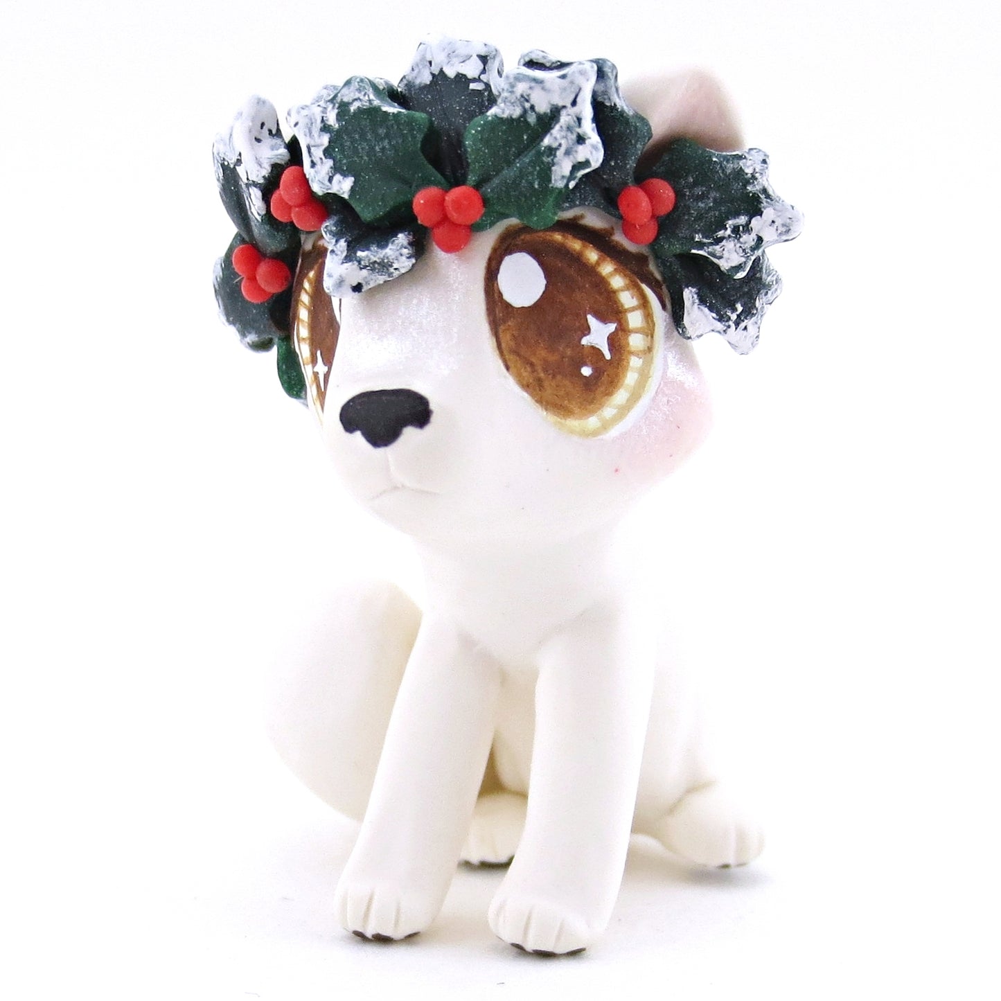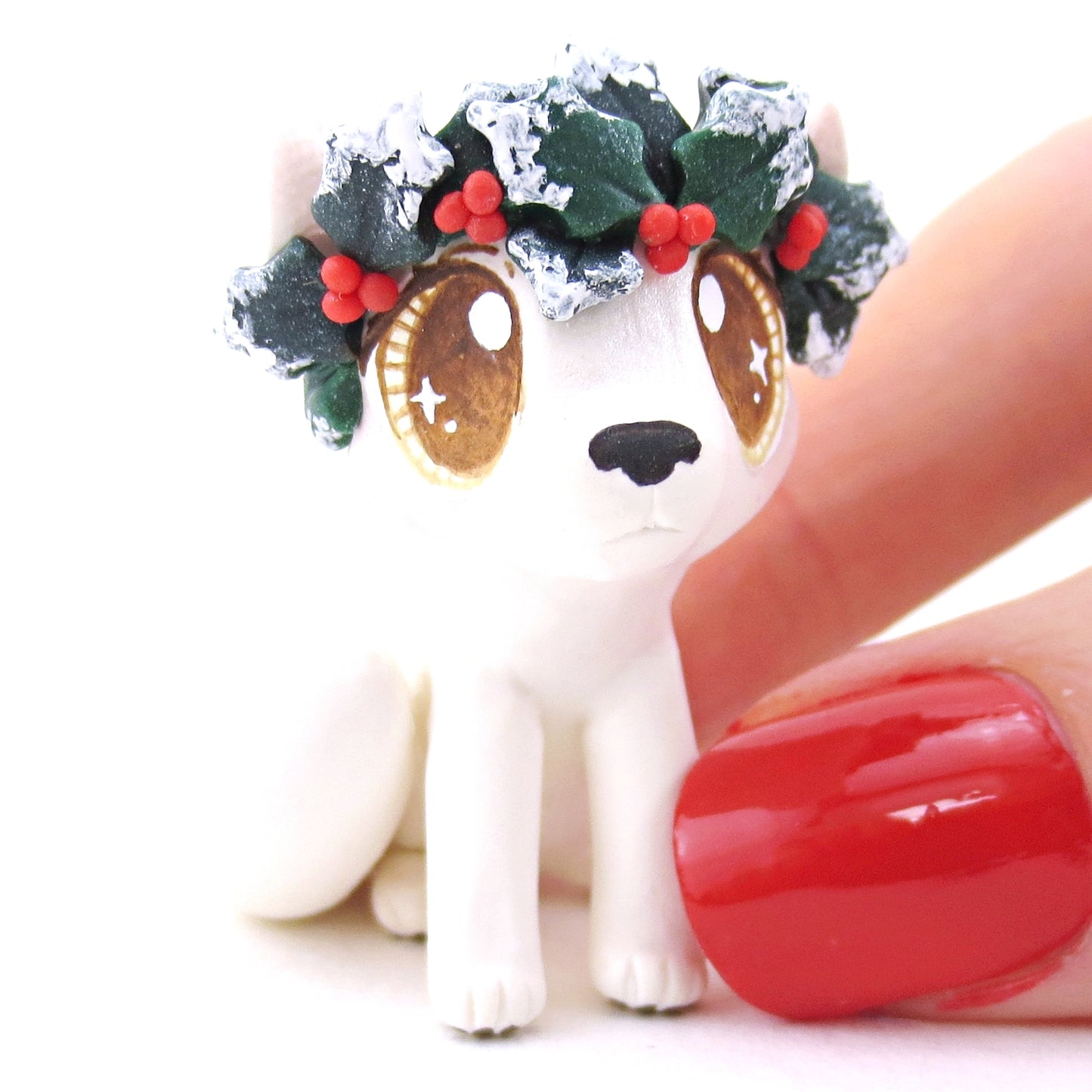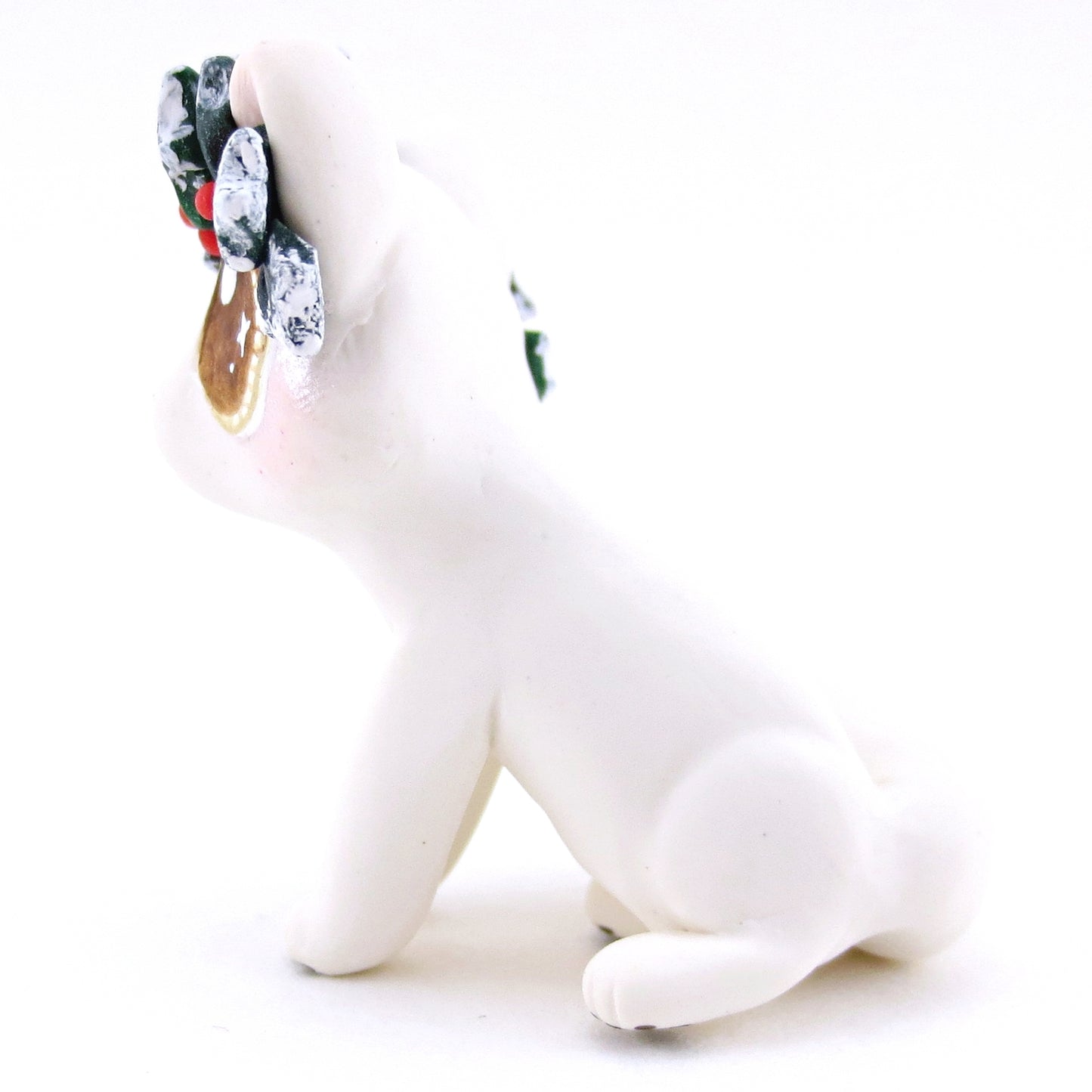 Arctic Fox with Holly Crown Figurine - Polymer Clay Christmas Animals