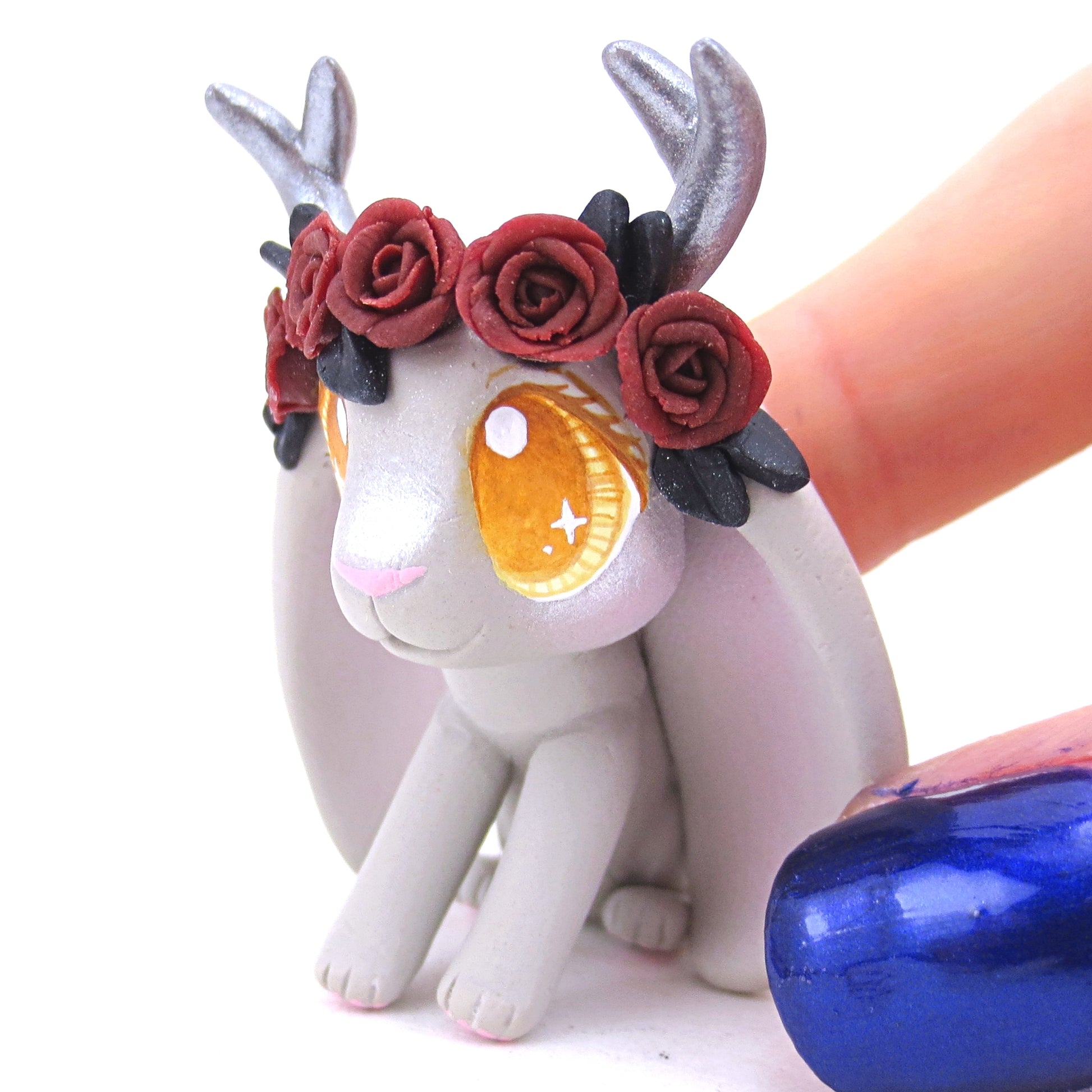 Black and Red Rose Crown Grey Jackalope Figurine - Polymer Clay Animals