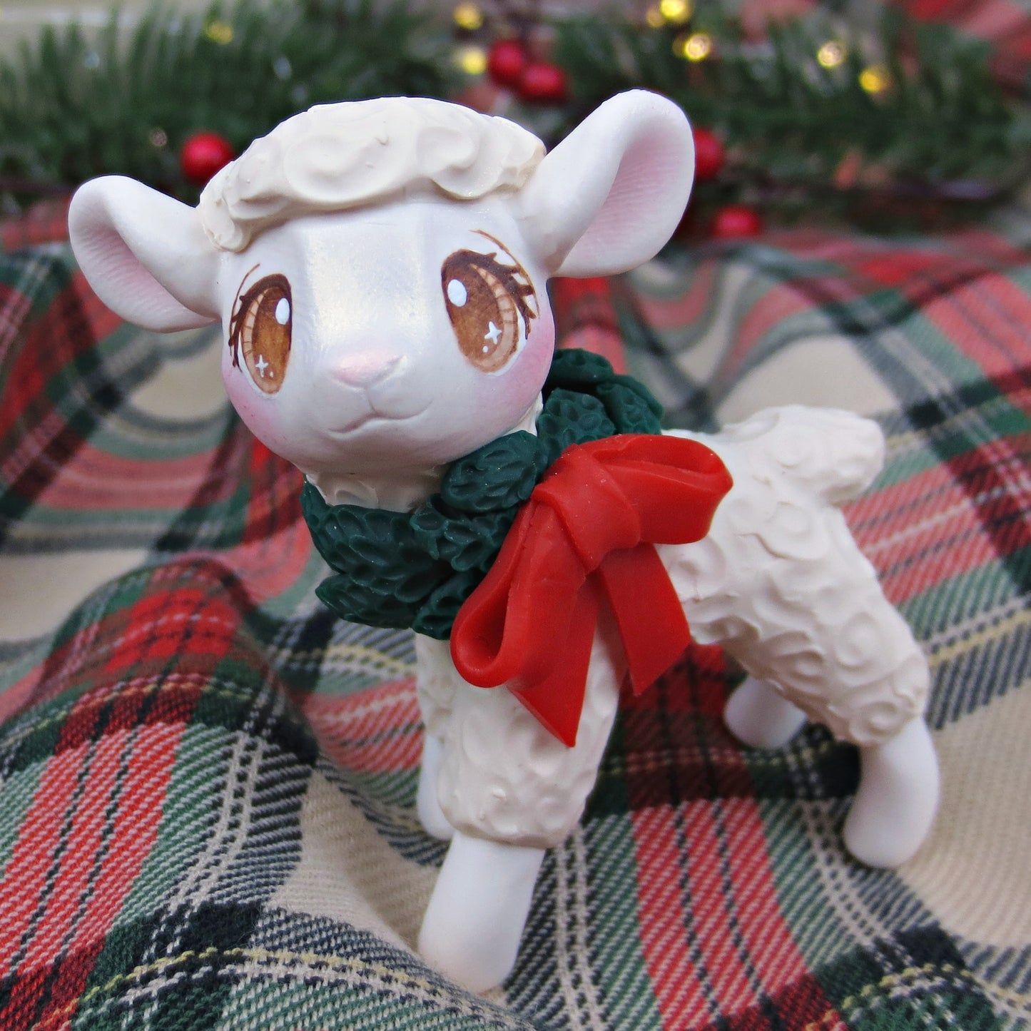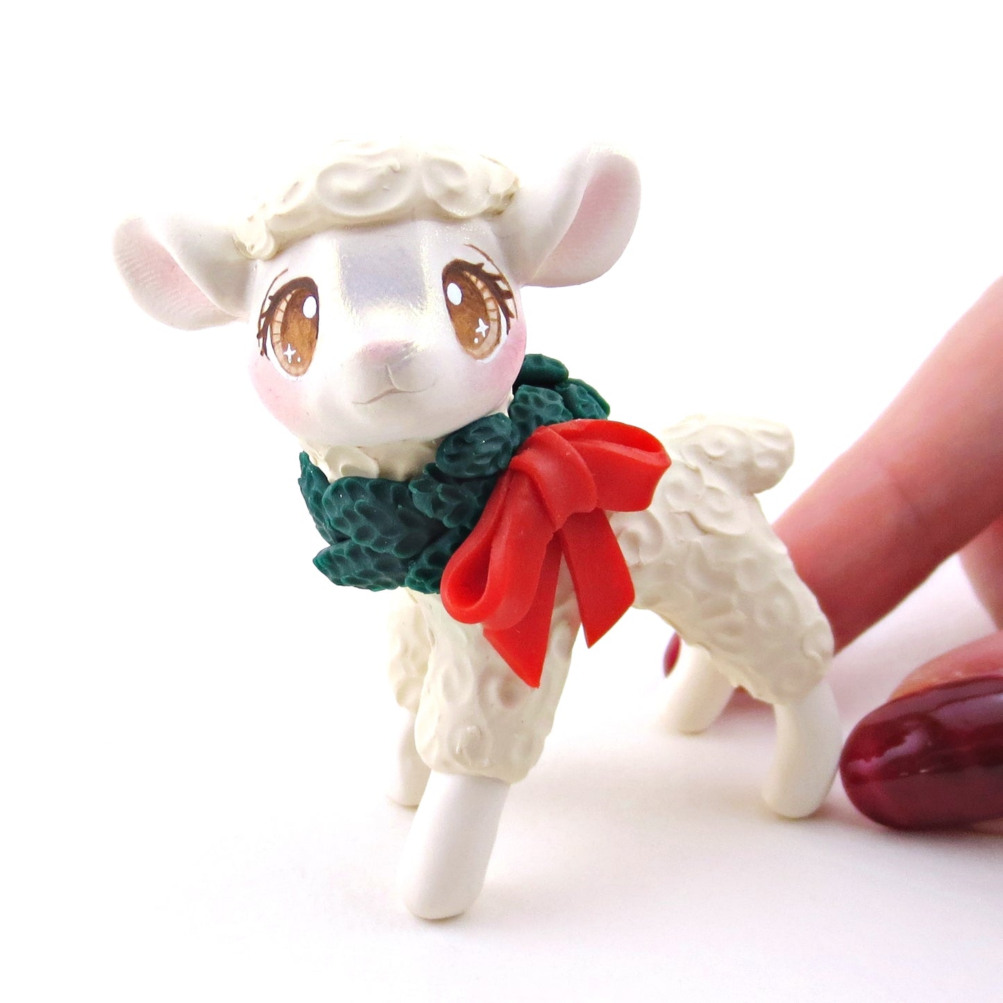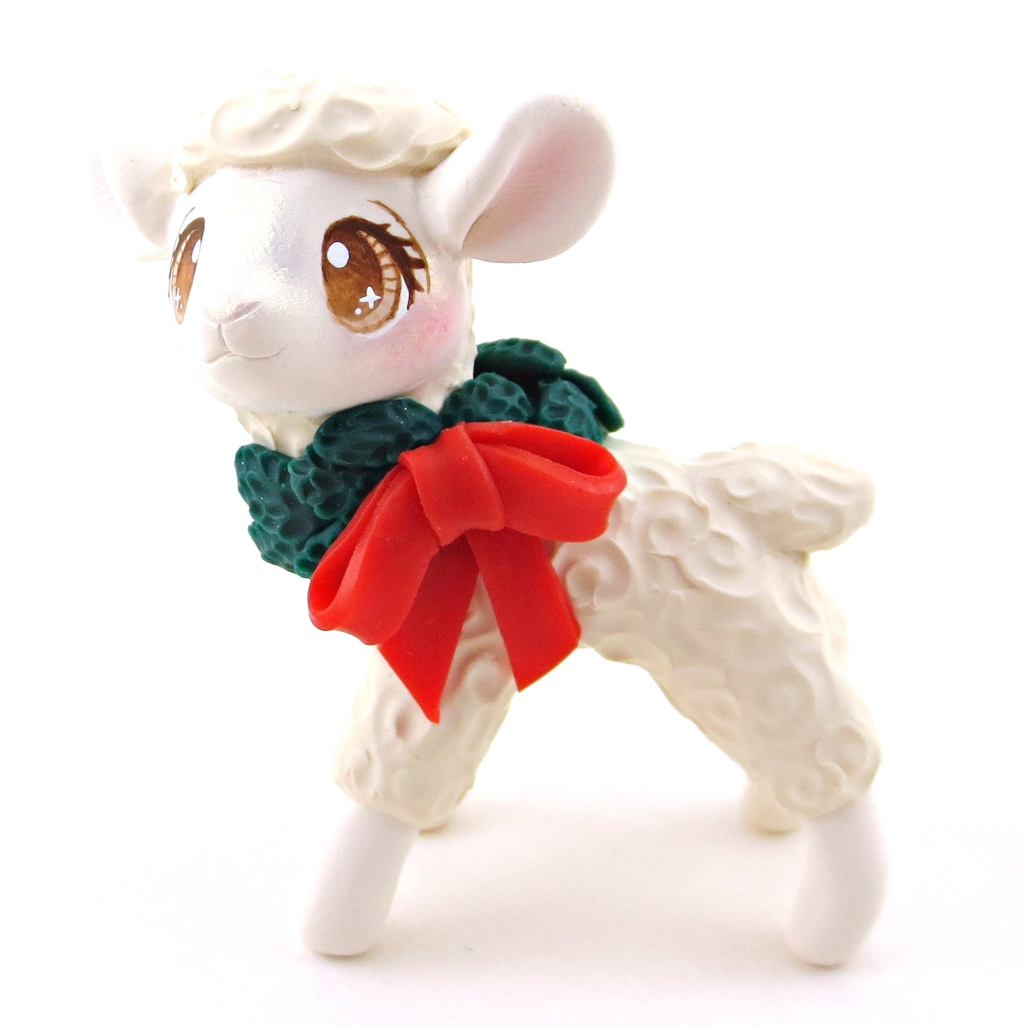 Christmas Wreath Sheep Figurine - Polymer Clay Christmas Collection