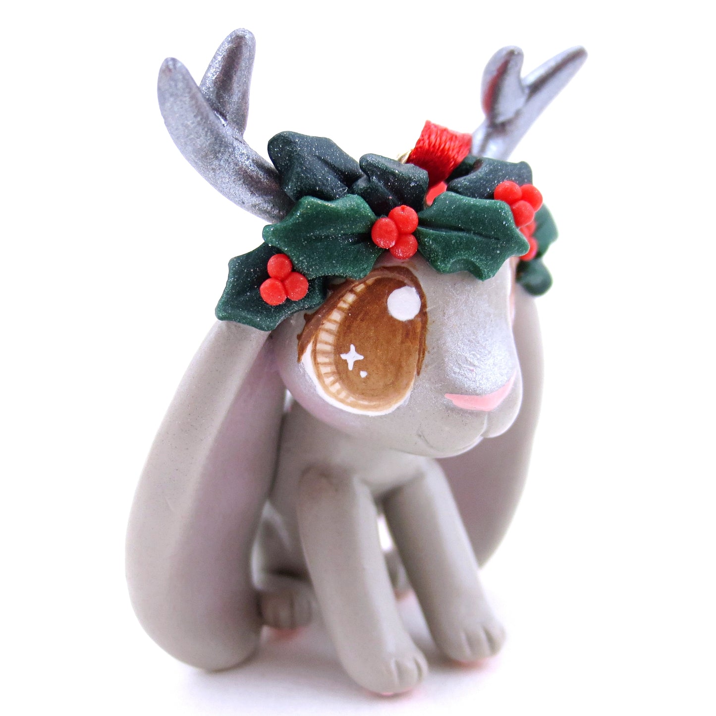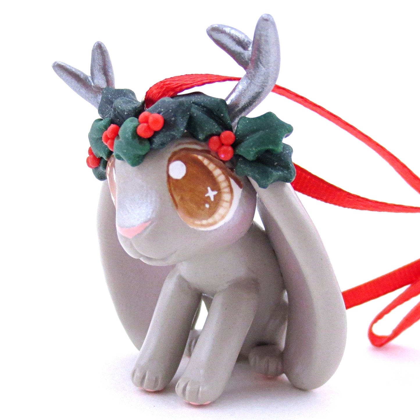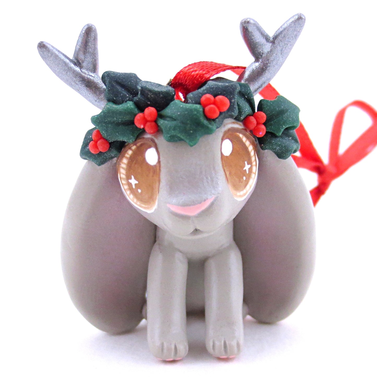 Holly Crown Grey Jackalope Ornament - Polymer Clay Christmas Animals