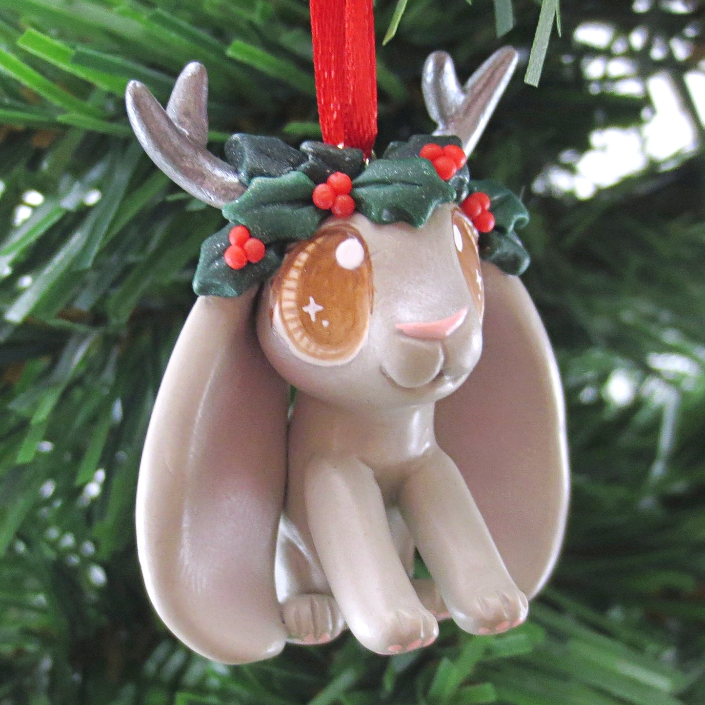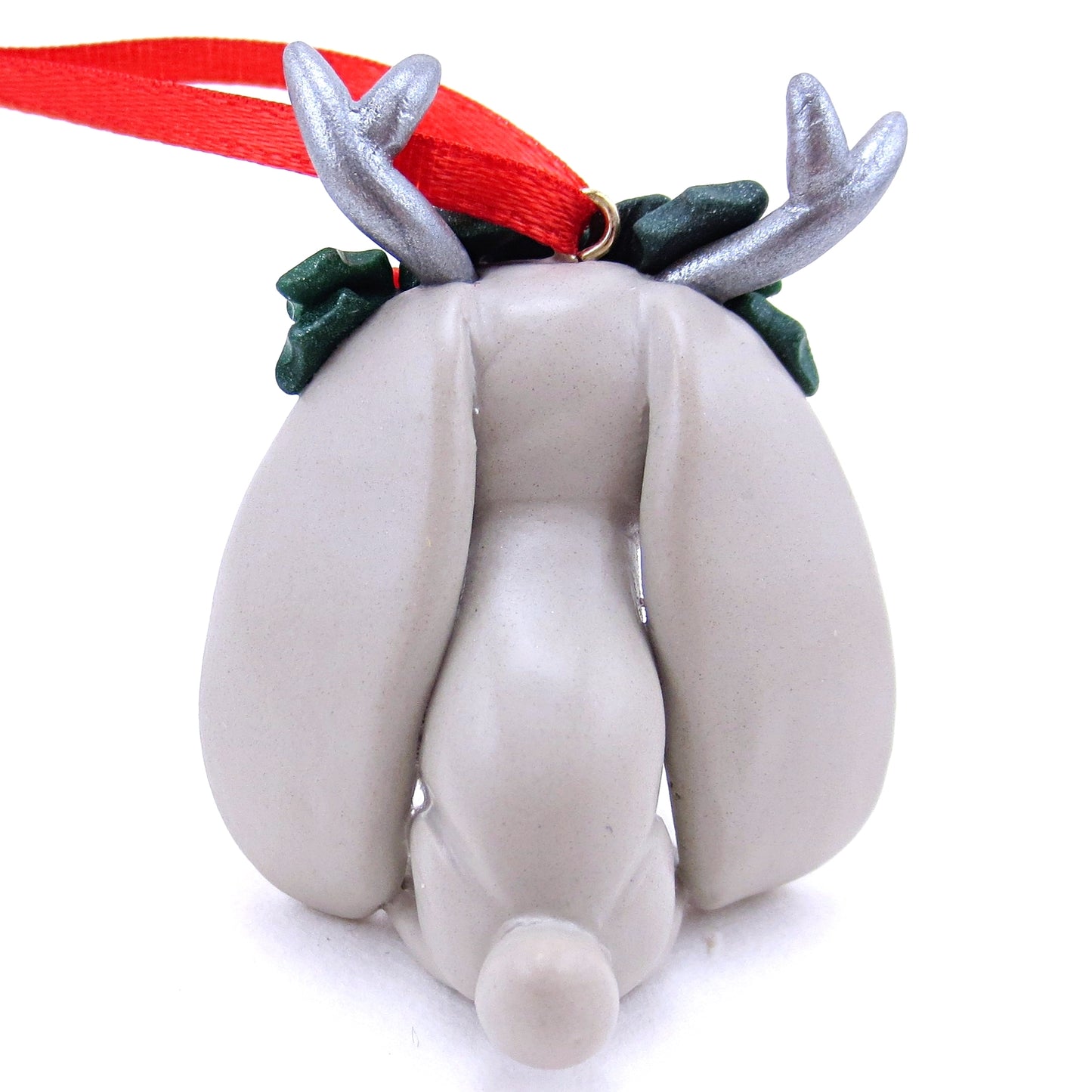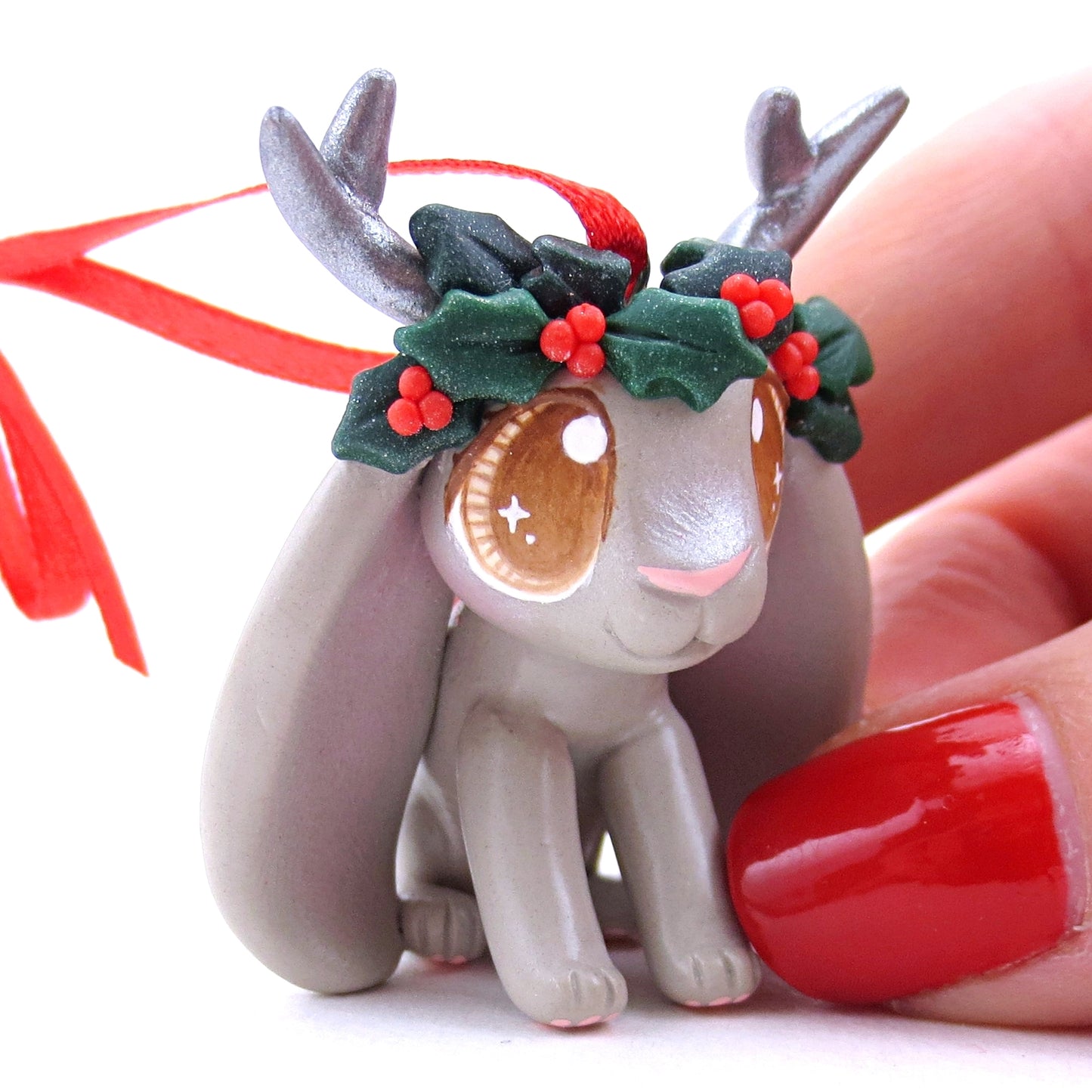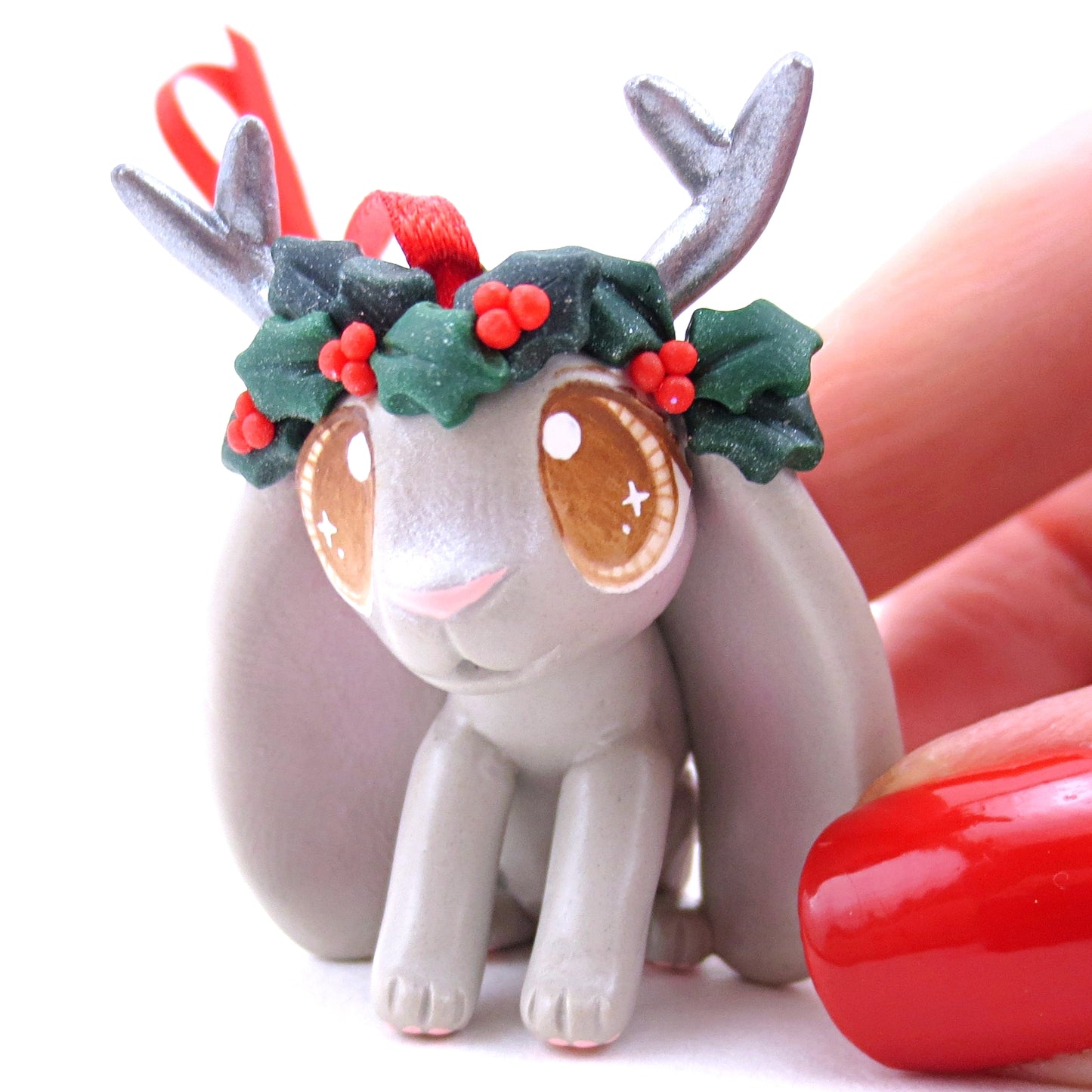 Holly Crown Grey Jackalope Ornament - Polymer Clay Christmas Animals