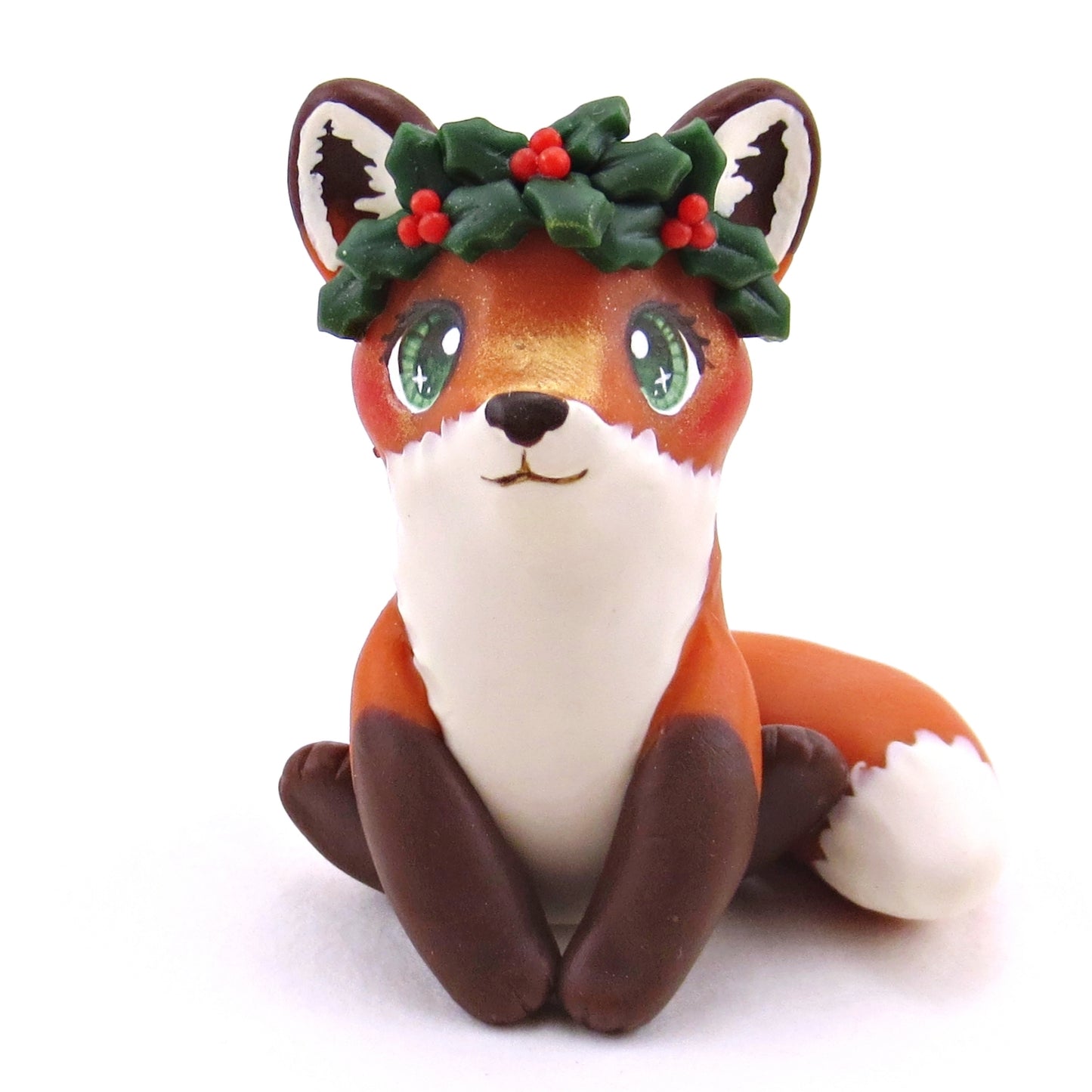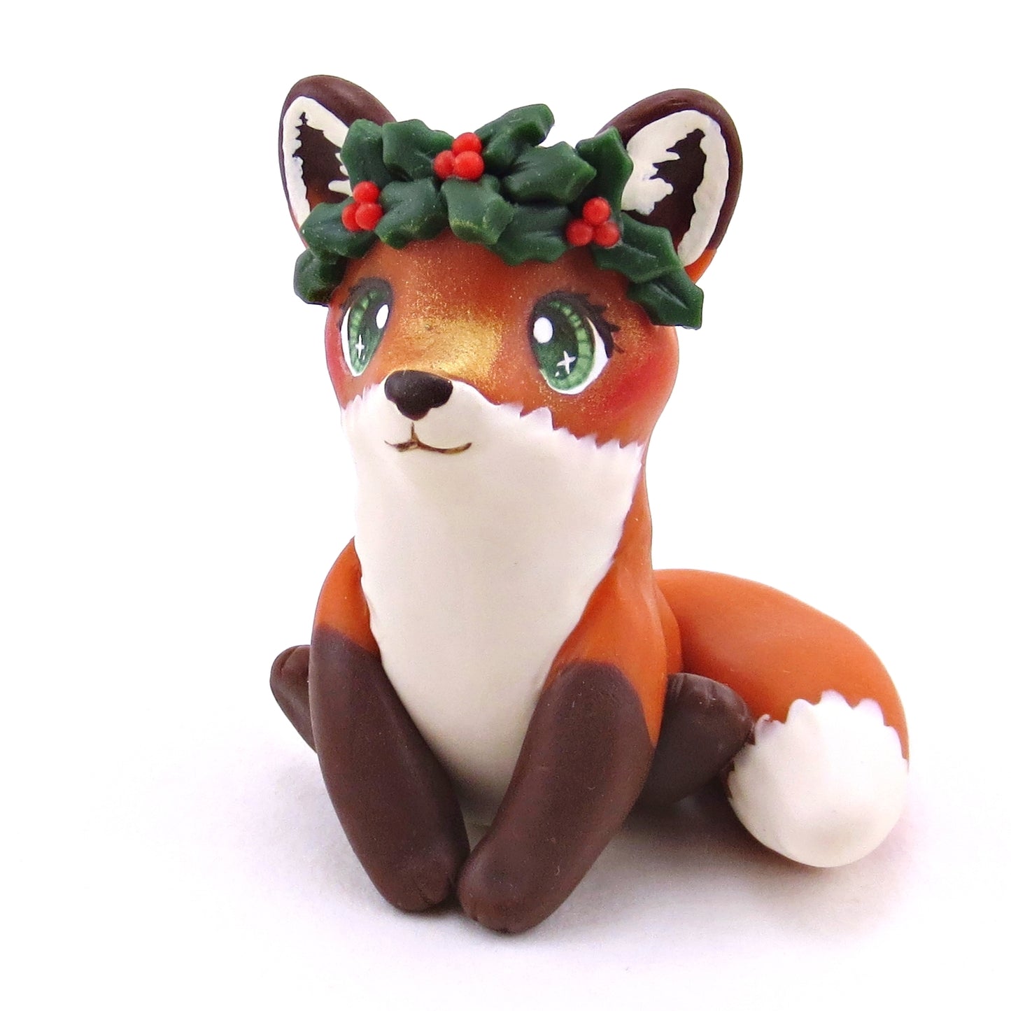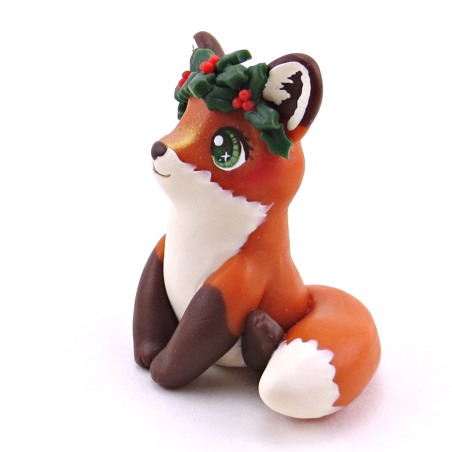Holly Crown Red Fox Figurine - Polymer Clay Christmas Collection
