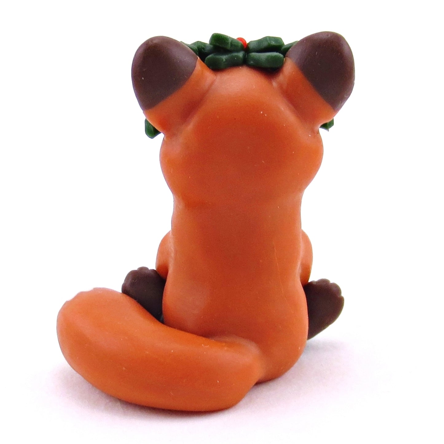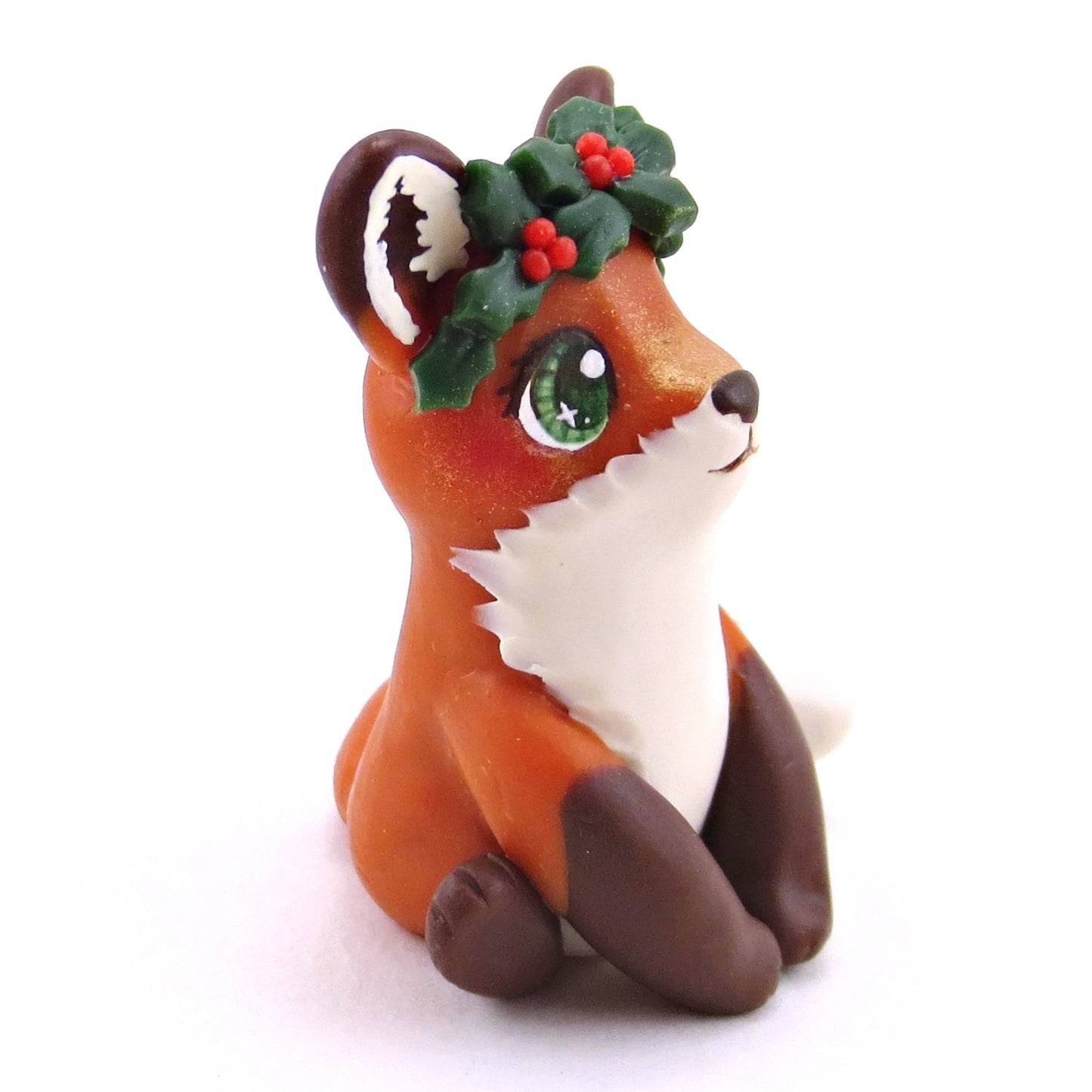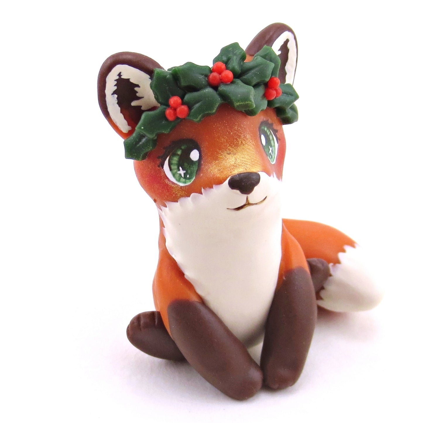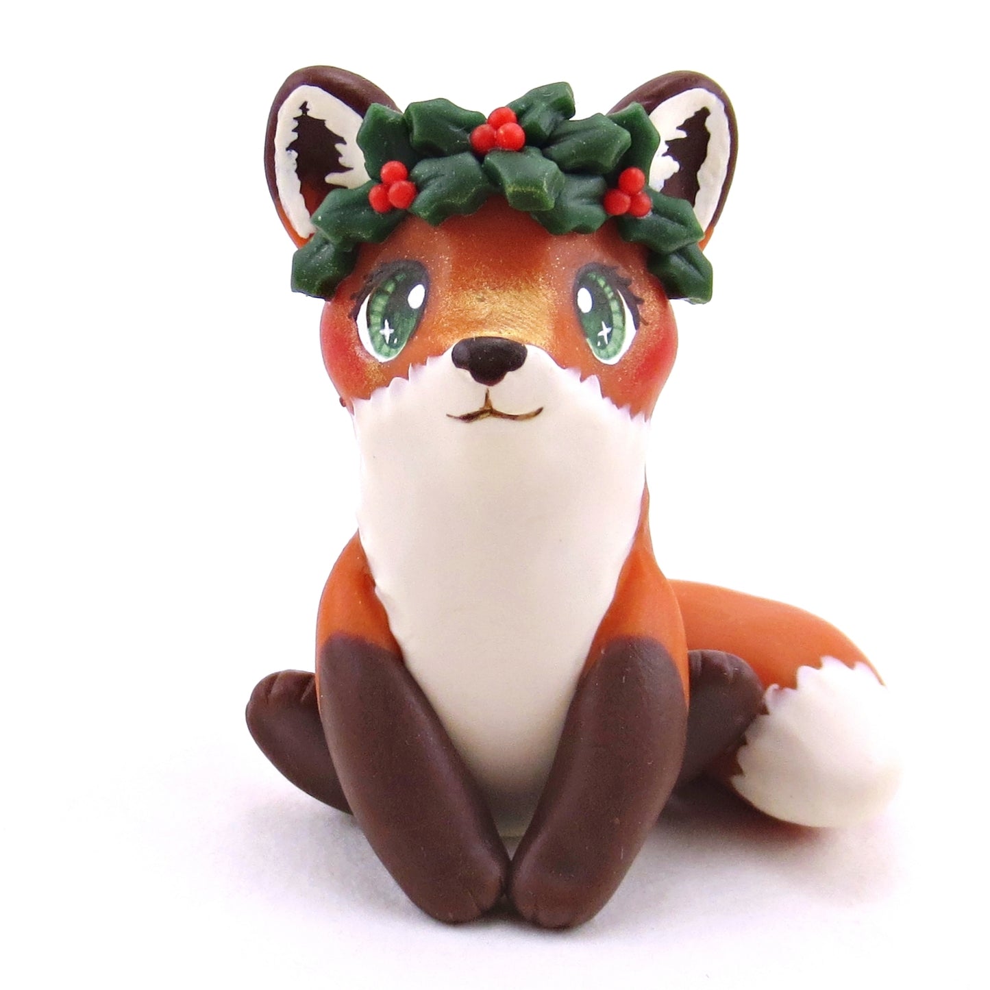 Holly Crown Red Fox Figurine - Polymer Clay Christmas Collection
