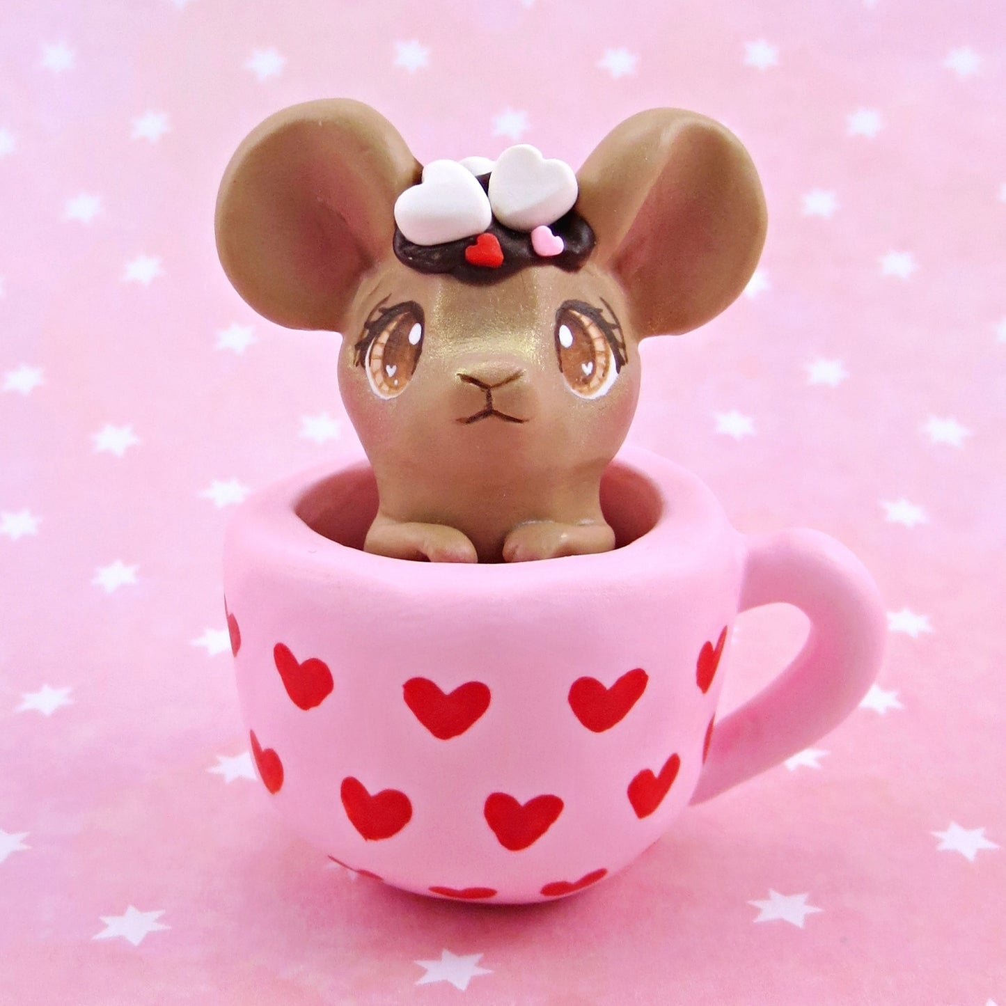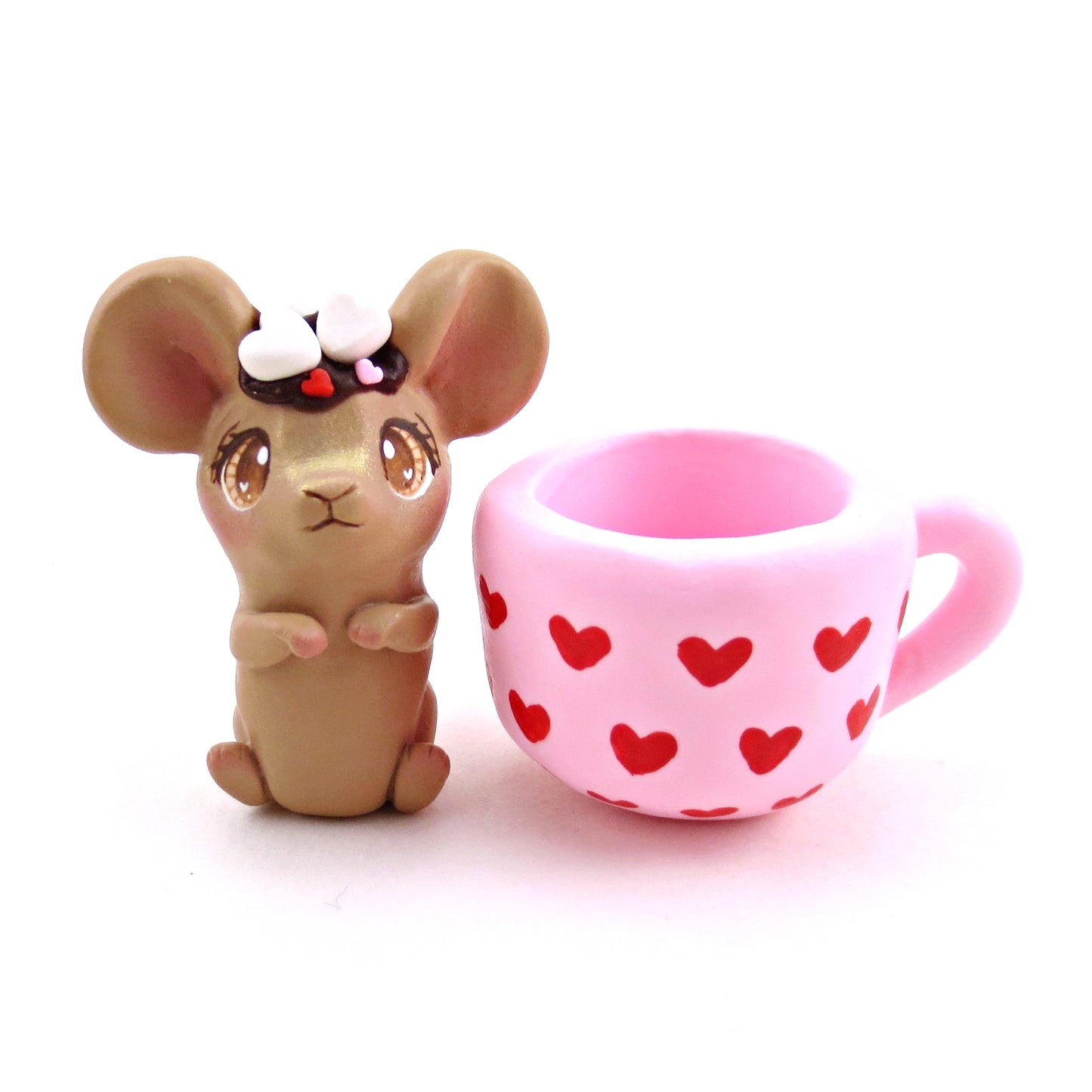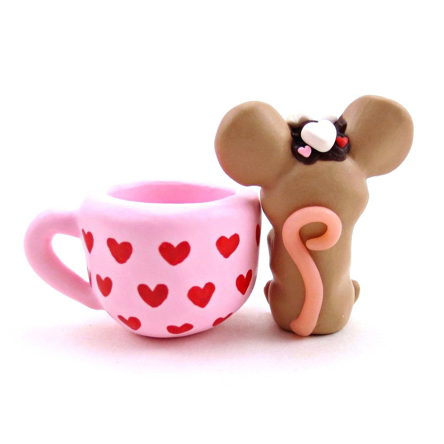 Hot Cocoa Mouse in a Valentine Mug Figurine - Polymer Clay Animals Valentine Collection