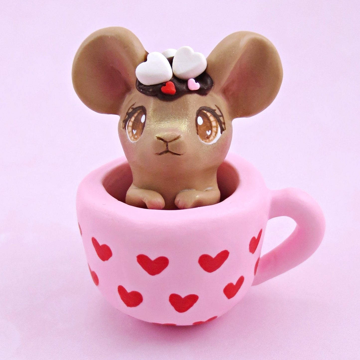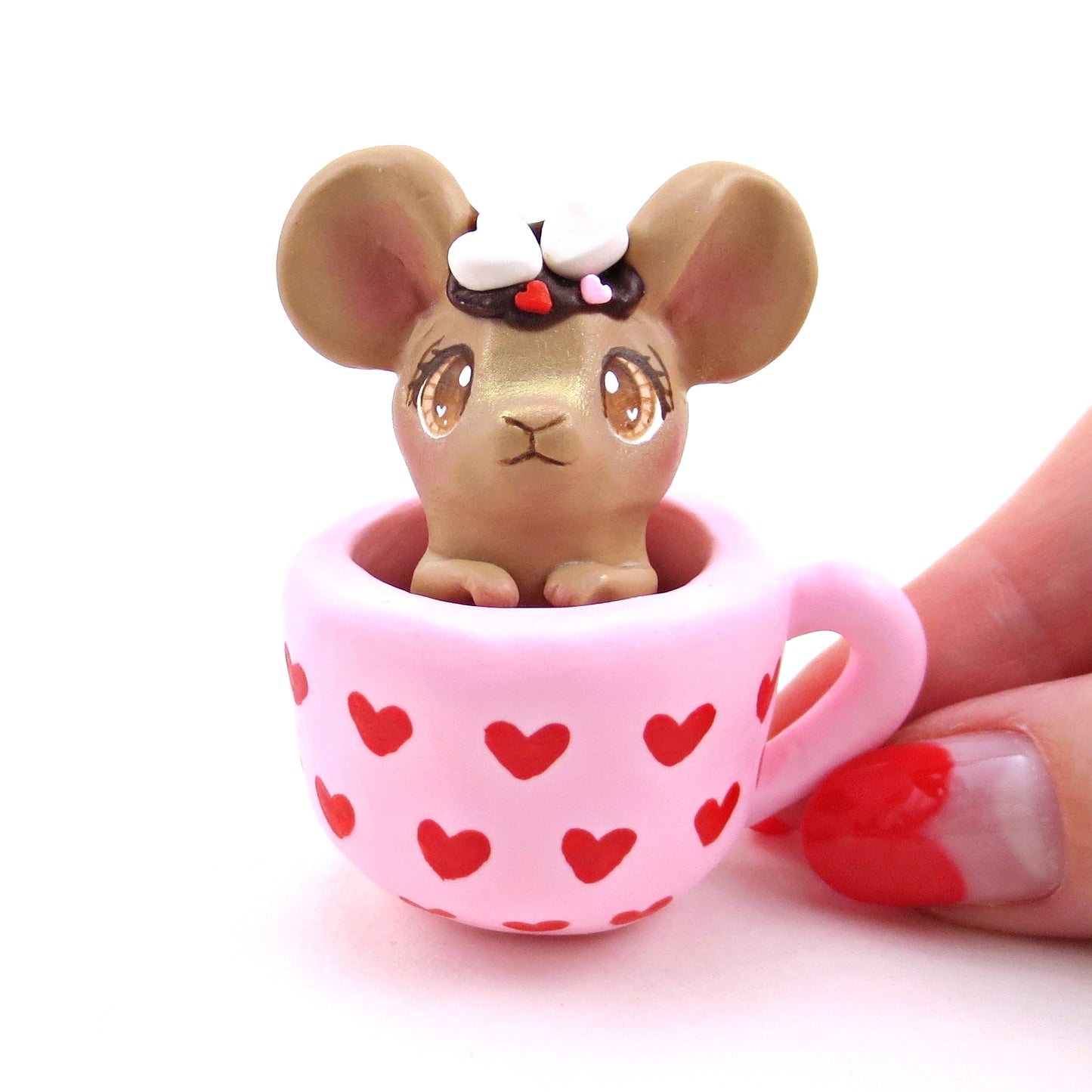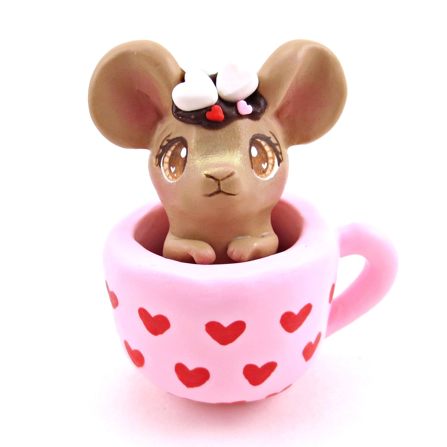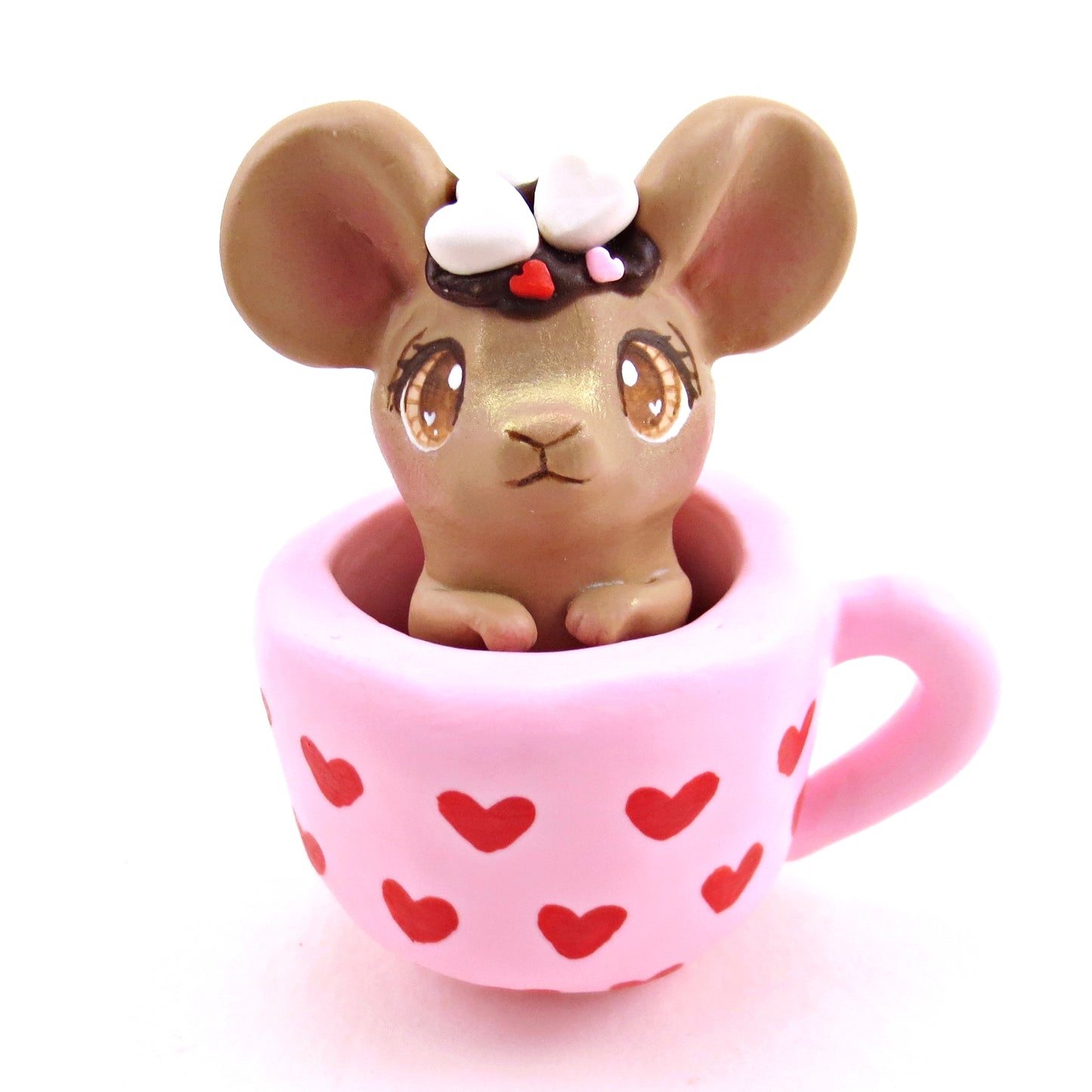 Hot Cocoa Mouse in a Valentine Mug Figurine - Polymer Clay Animals Valentine Collection