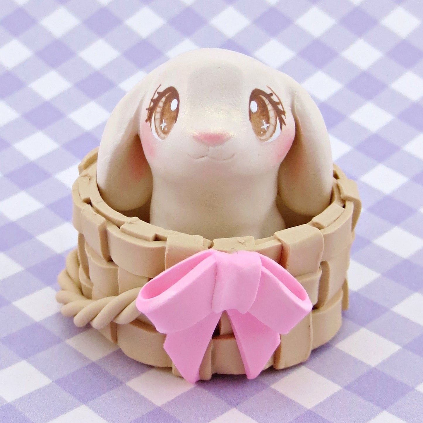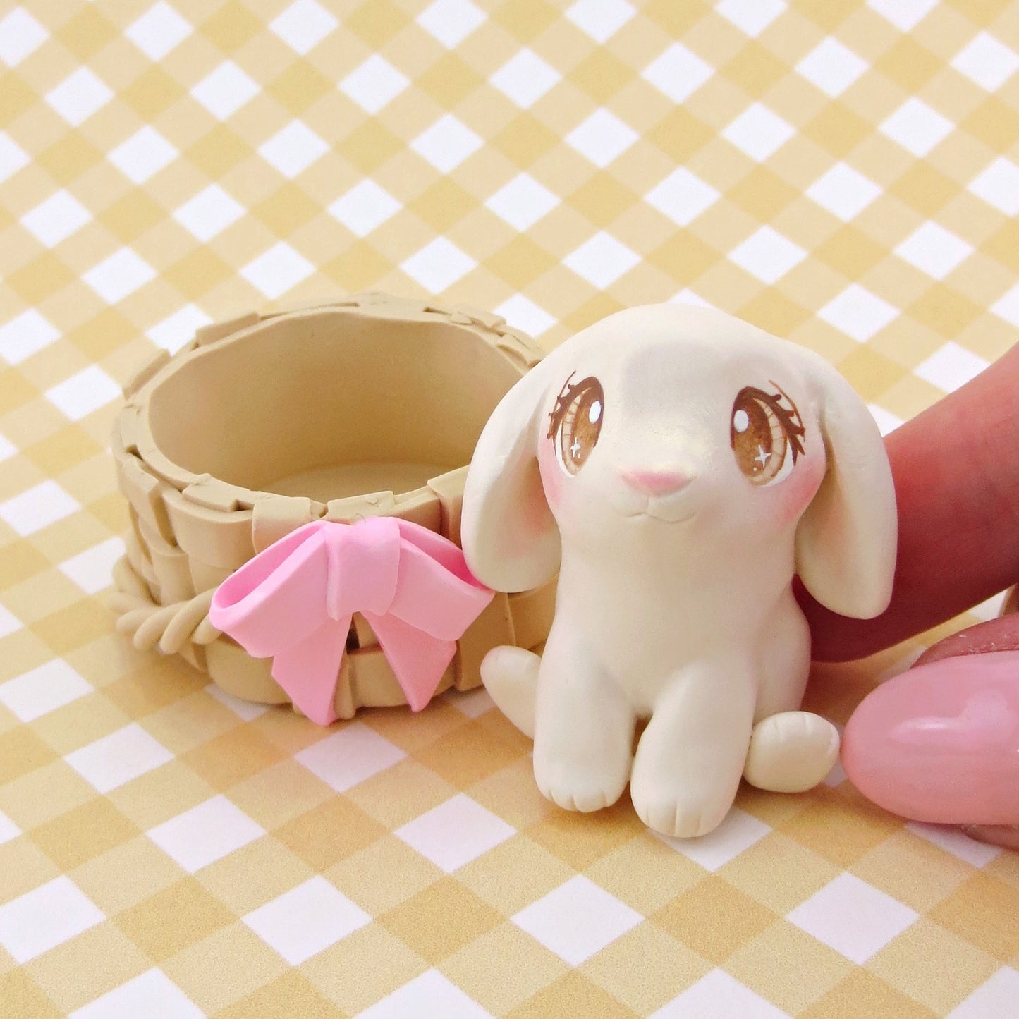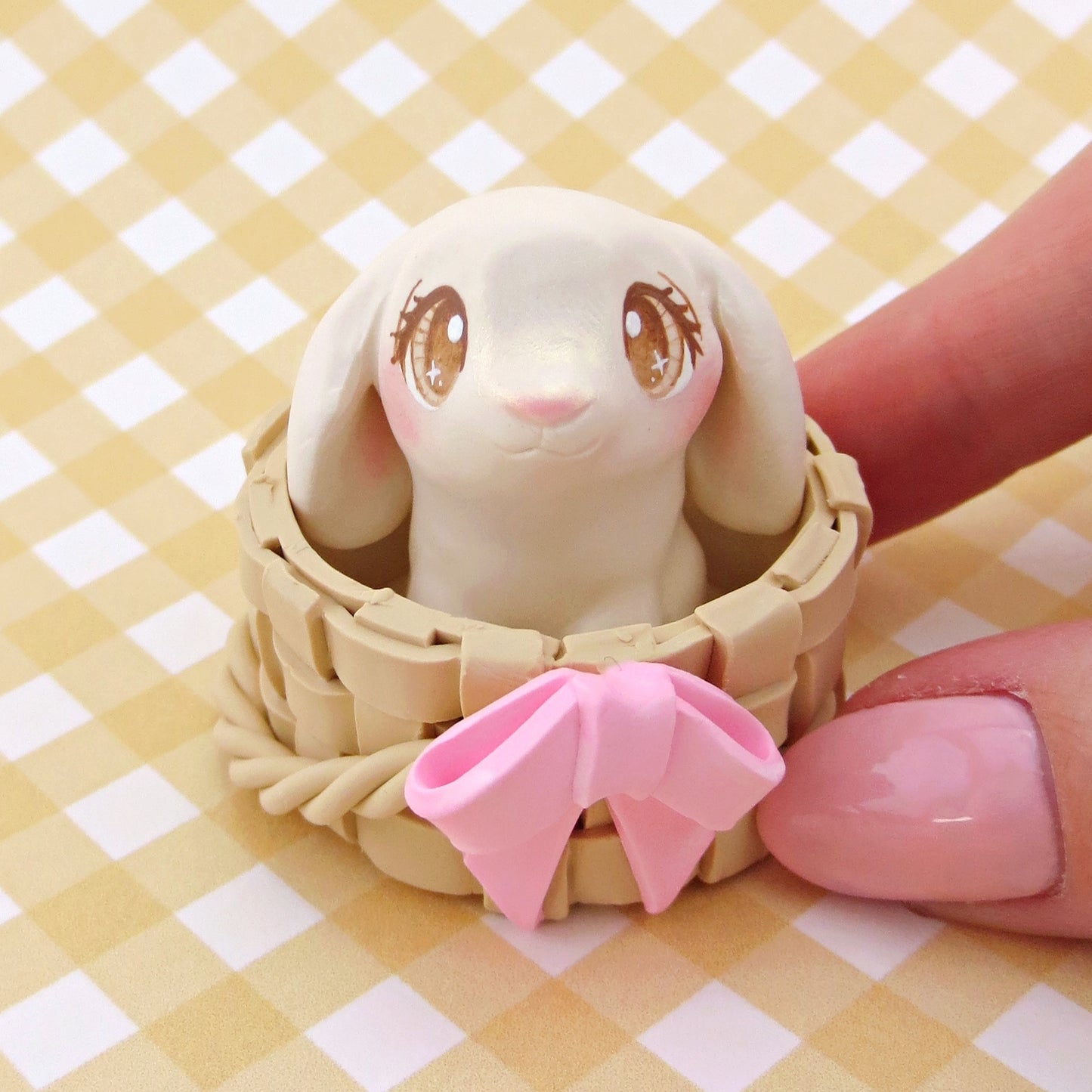 Lop Easter Bunny in Basket Figurine Set - Polymer Clay Easter Animal Collection