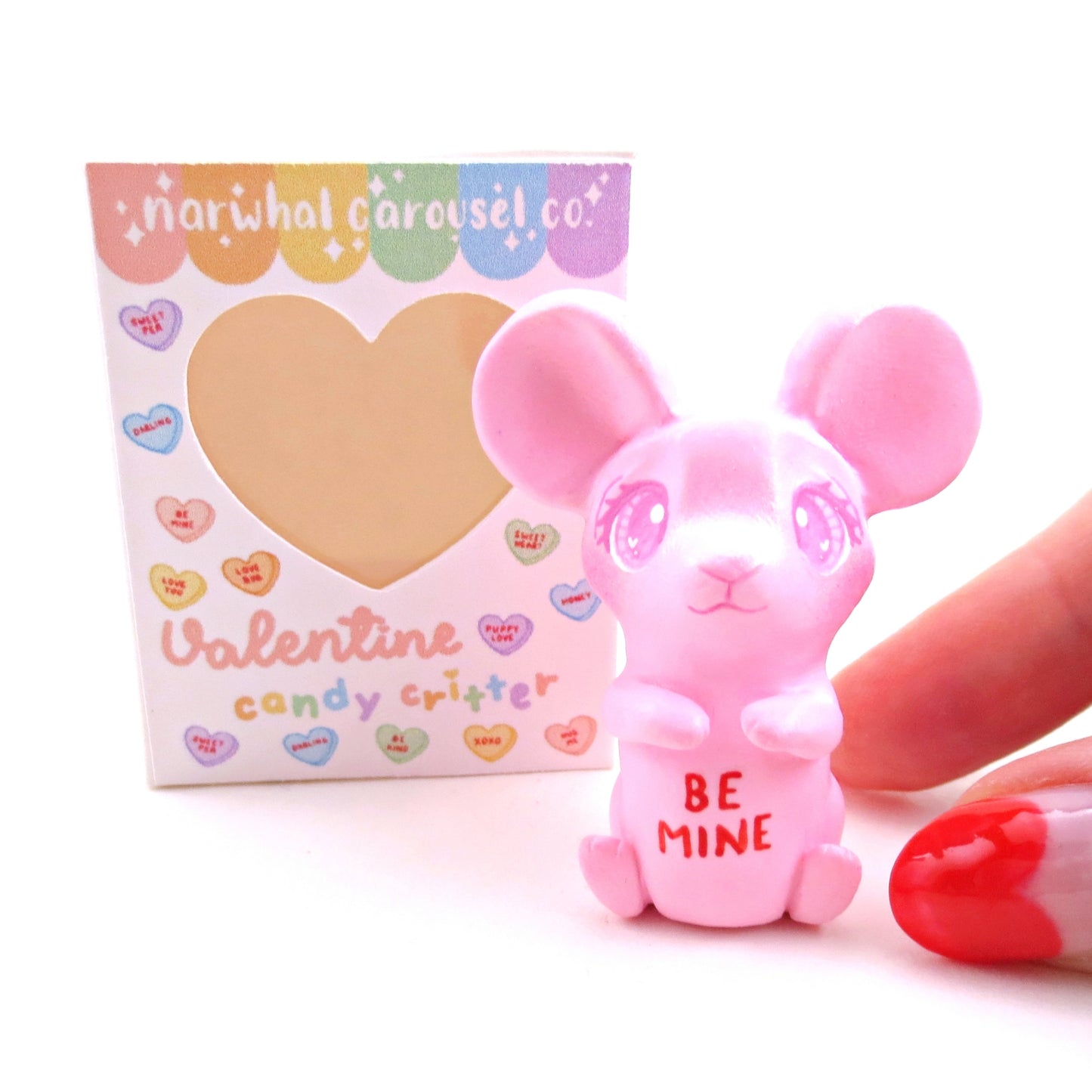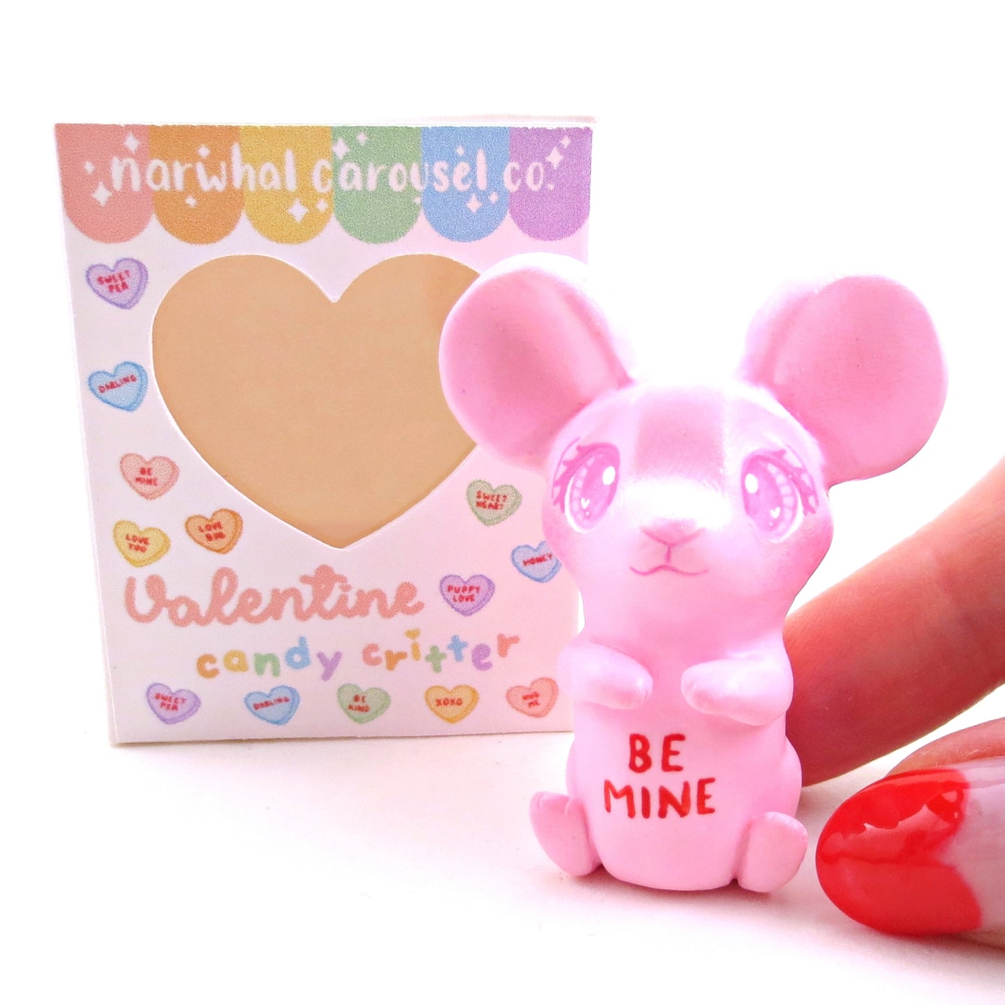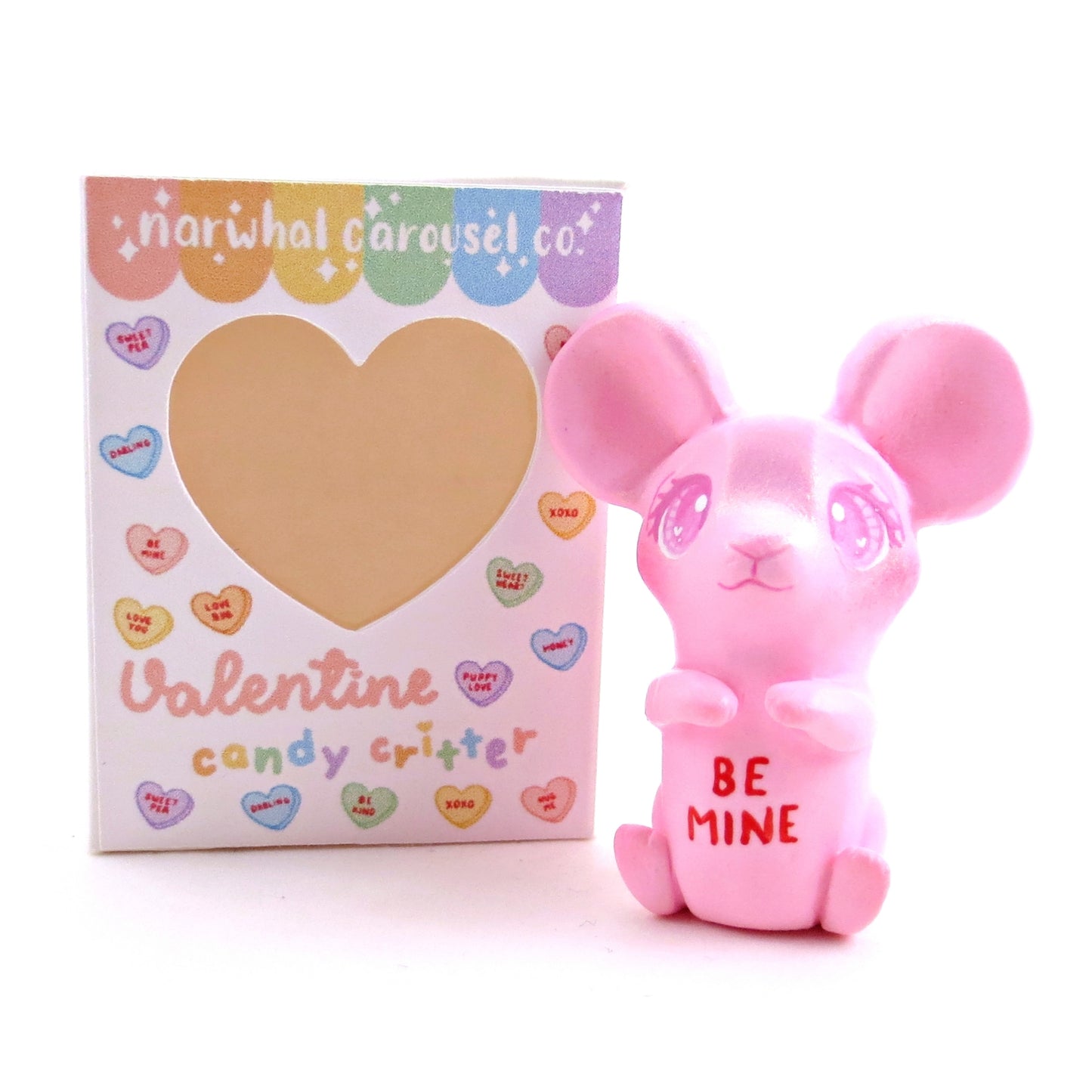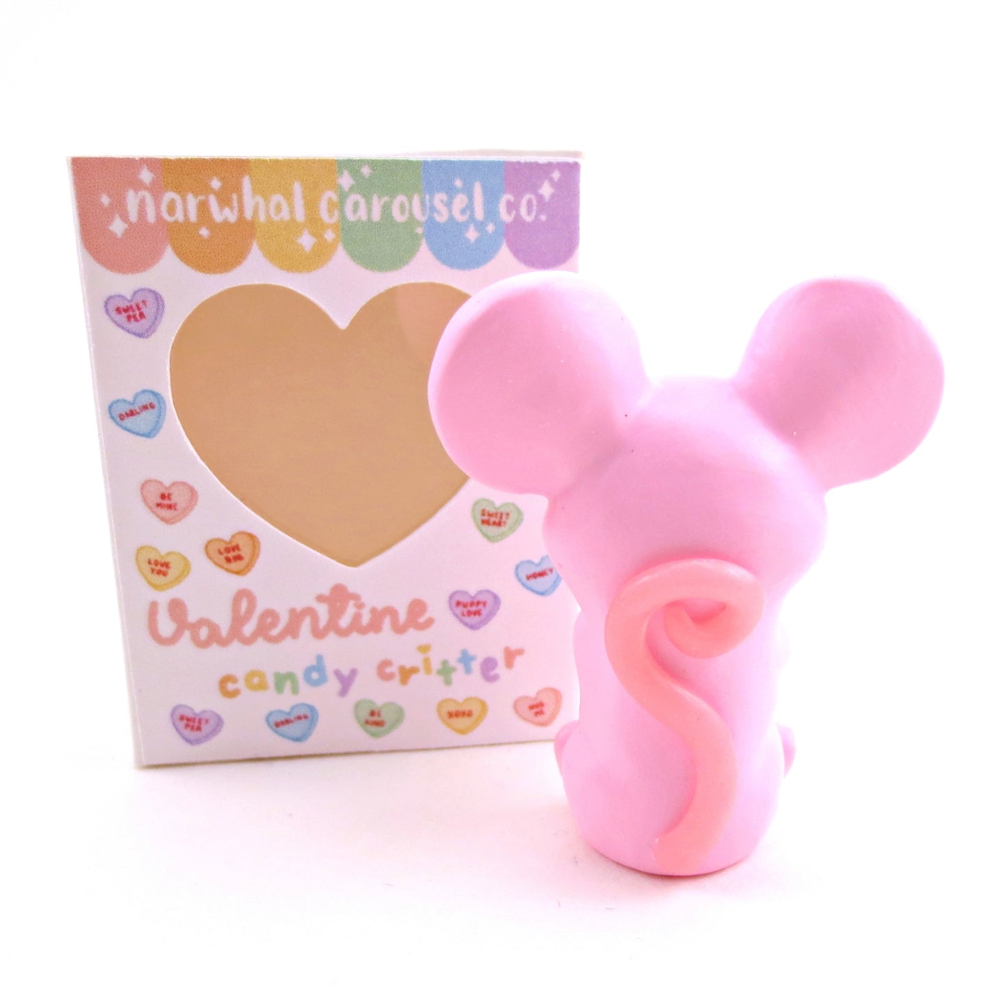 Pink Candy Heart Mouse Figurine with Box - Polymer Clay Animals Valentine Collection