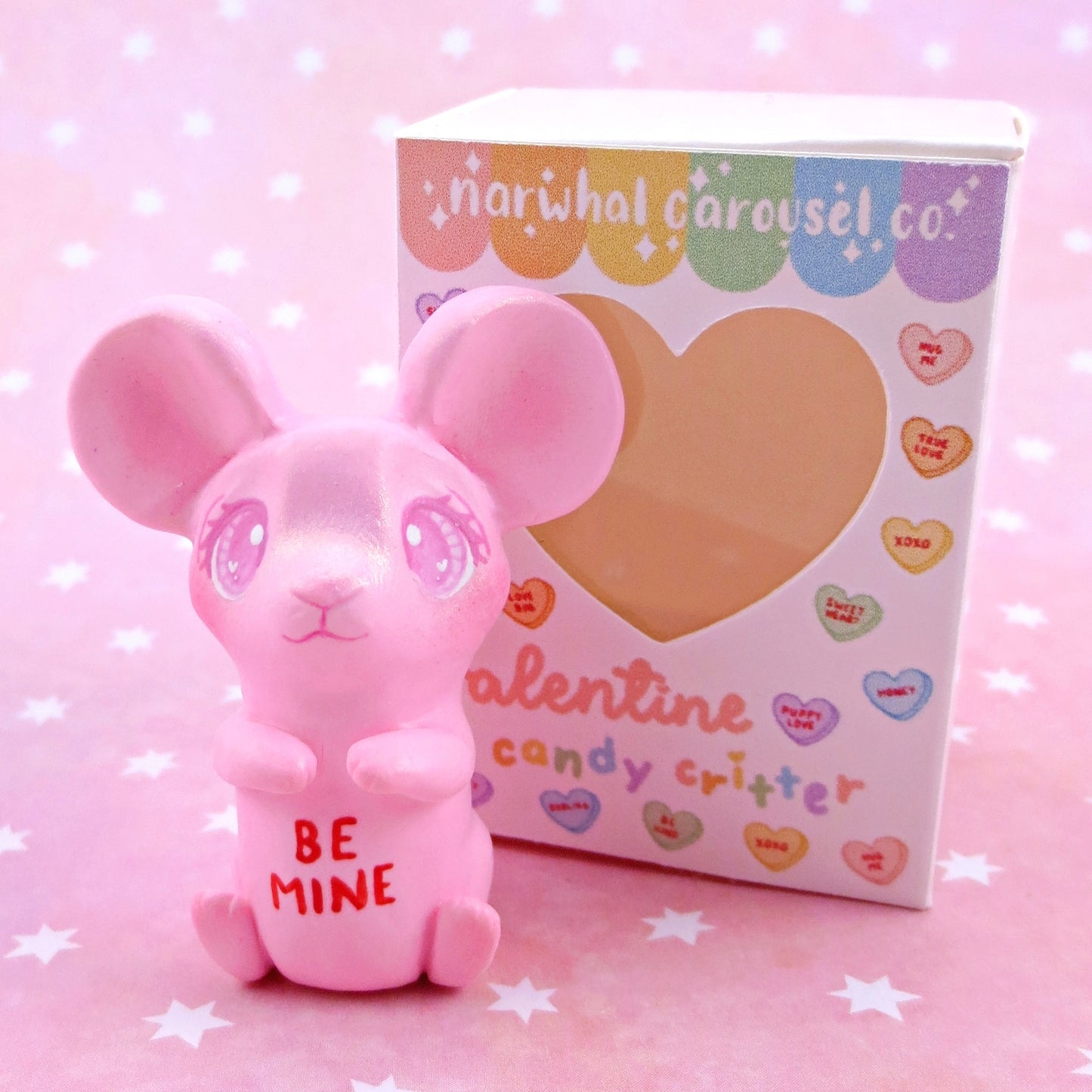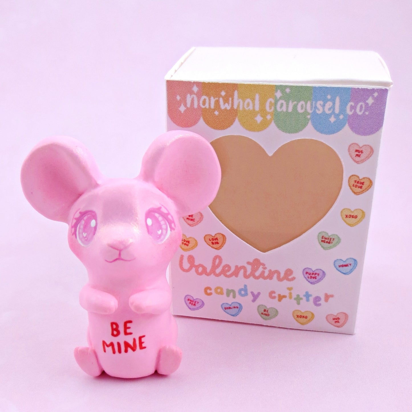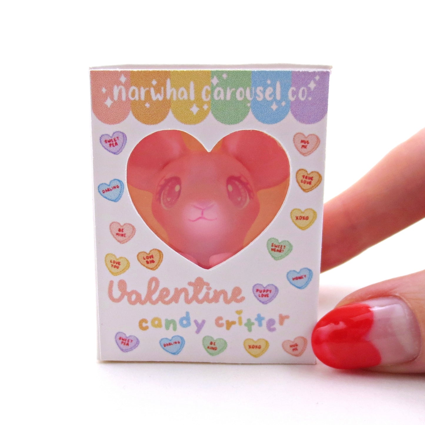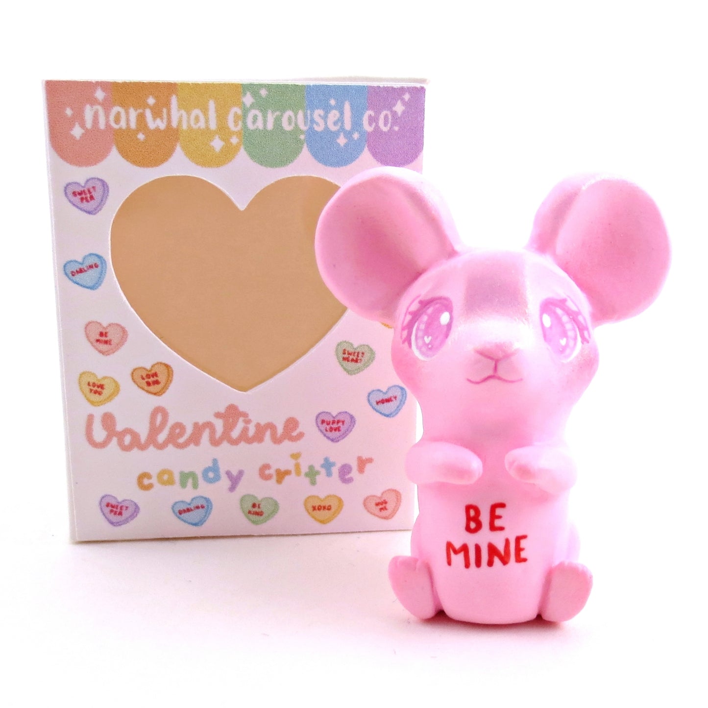 Pink Candy Heart Mouse Figurine with Box - Polymer Clay Animals Valentine Collection