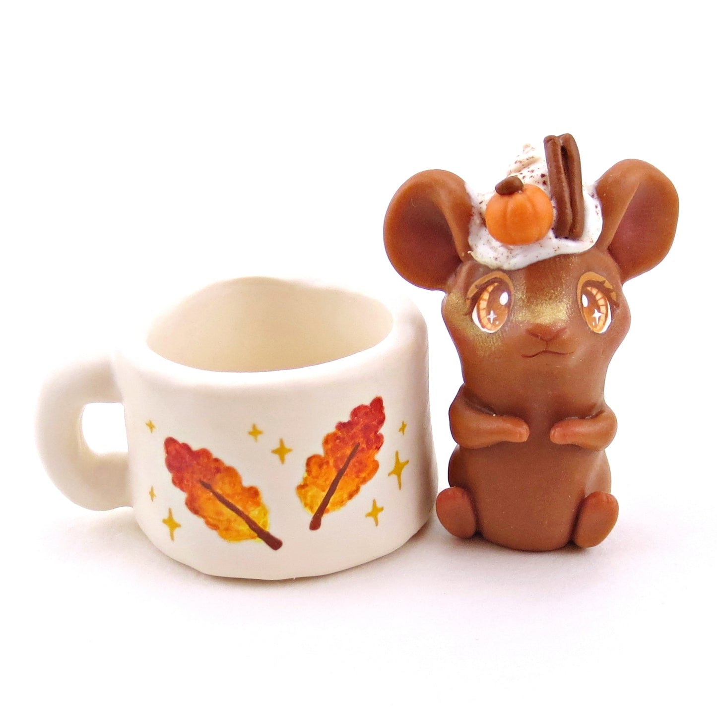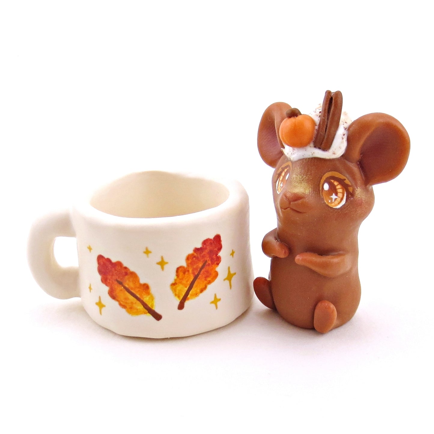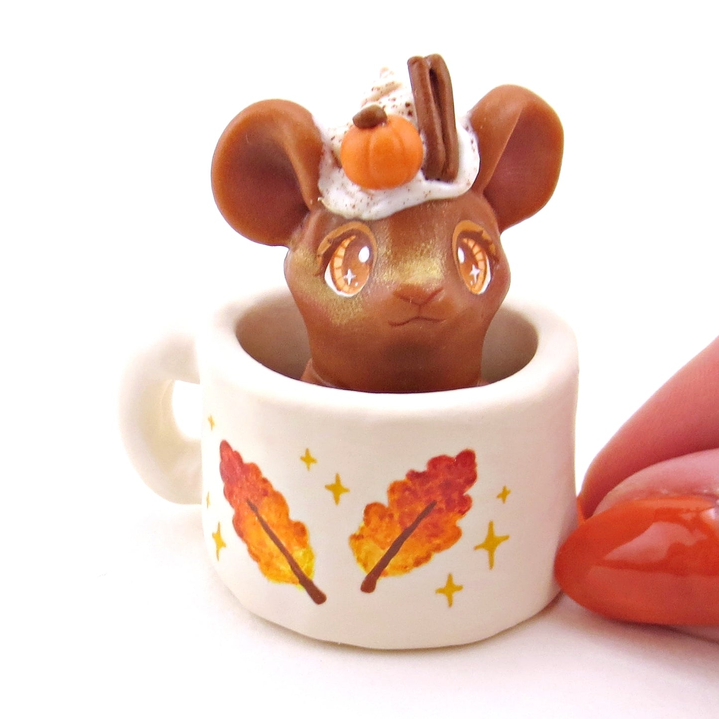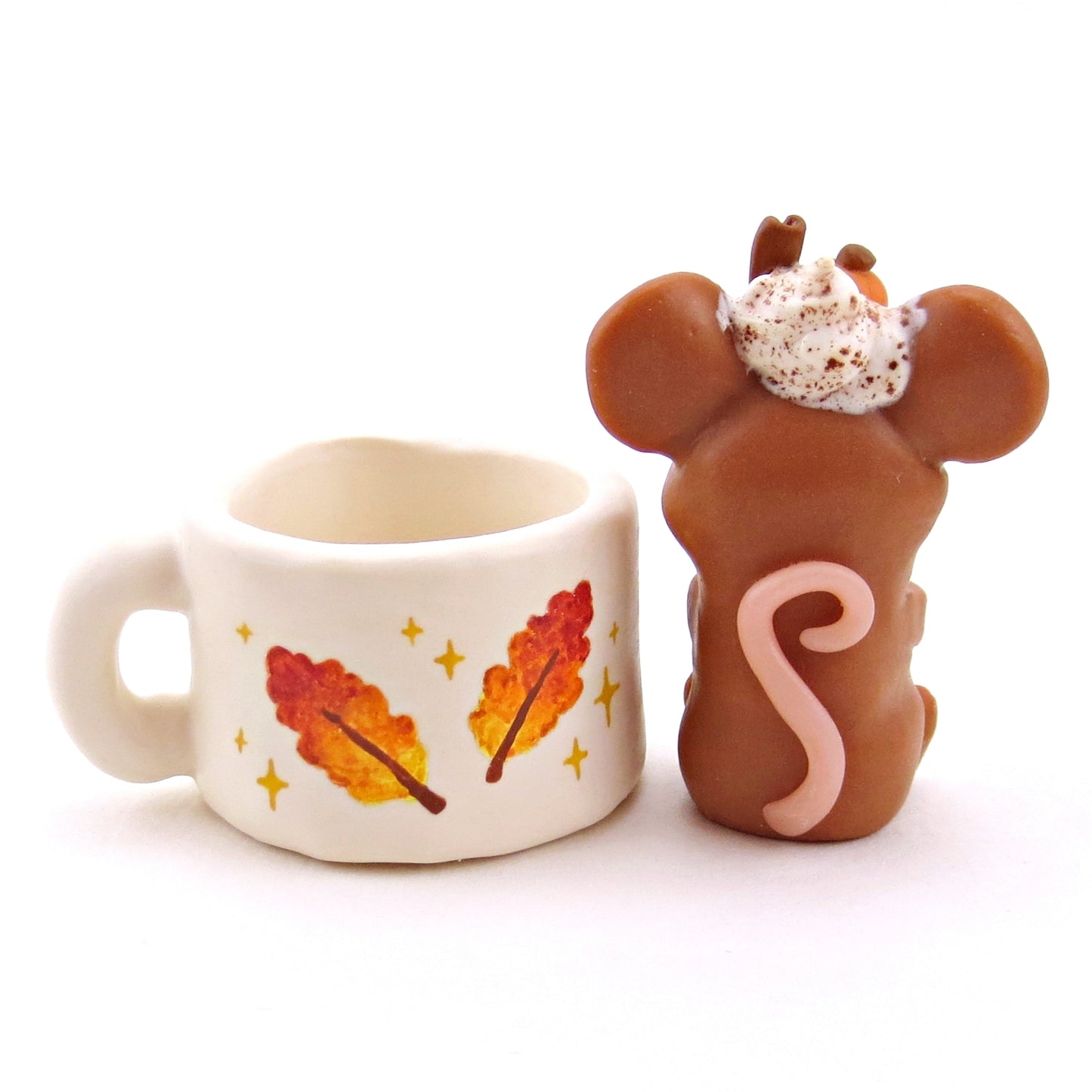 Pumpkin Spice Latte Mouse in a Leaf Mug Figurine - Polymer Clay Animals Fall and Halloween Collection