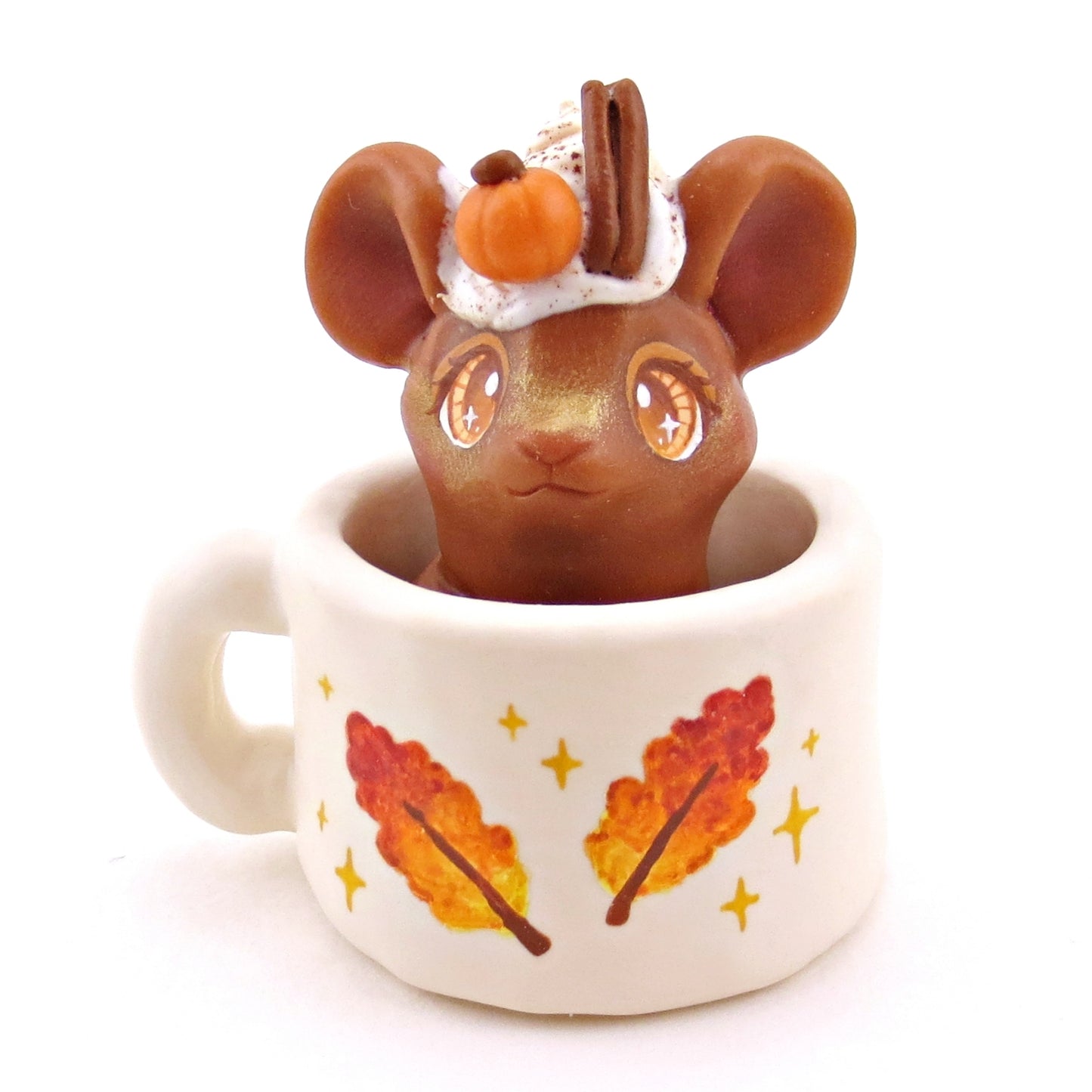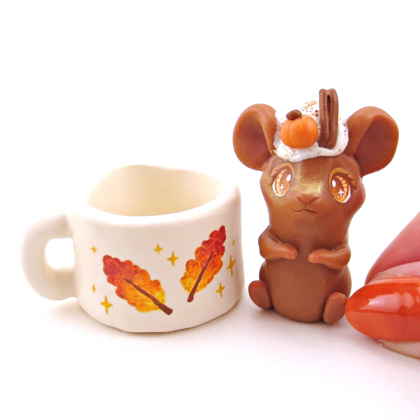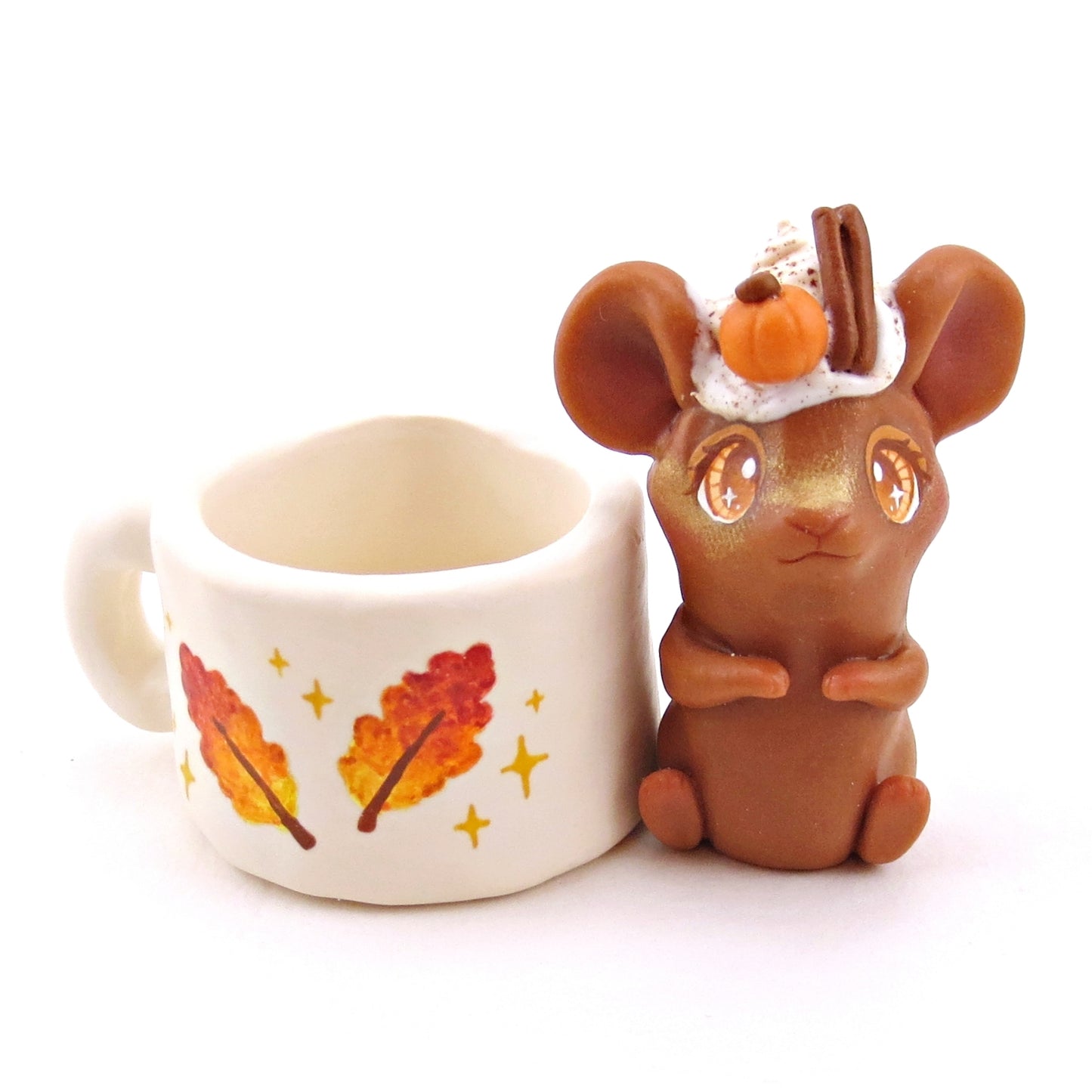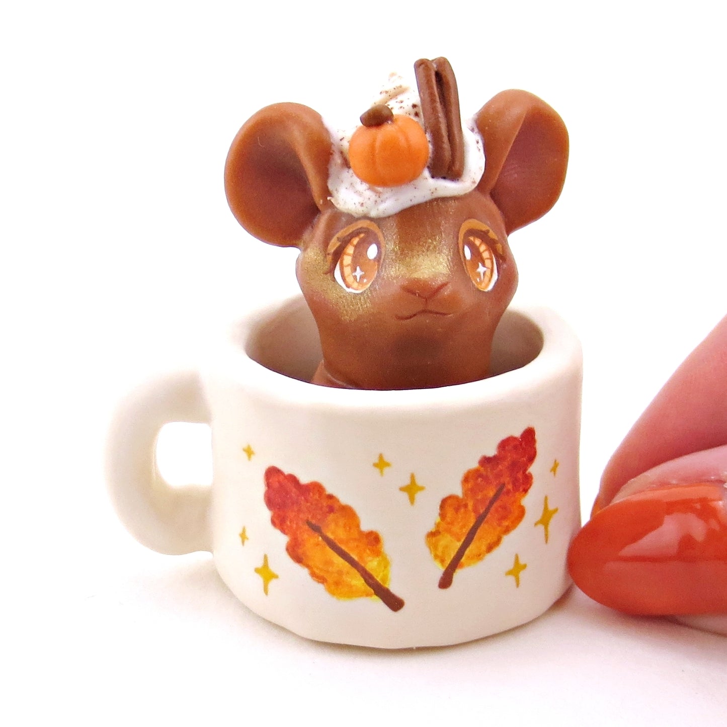 Pumpkin Spice Latte Mouse in a Leaf Mug Figurine - Polymer Clay Animals Fall and Halloween Collection