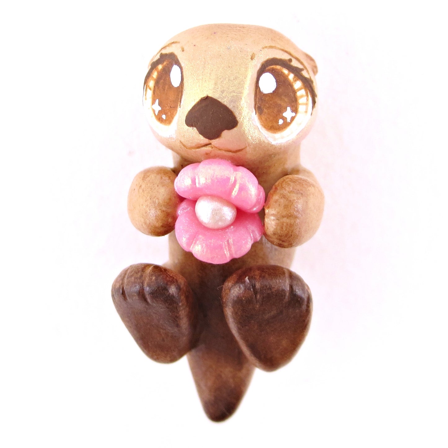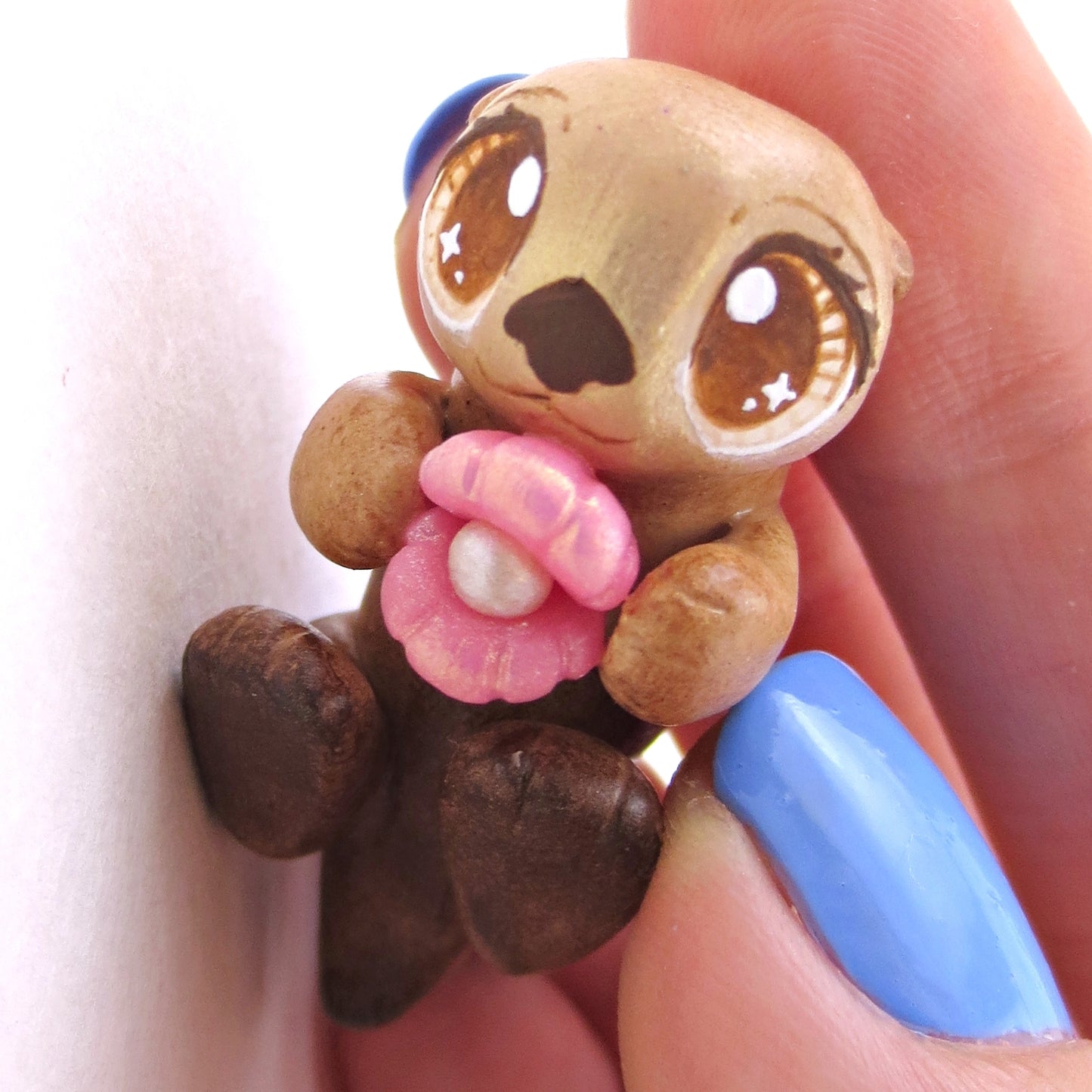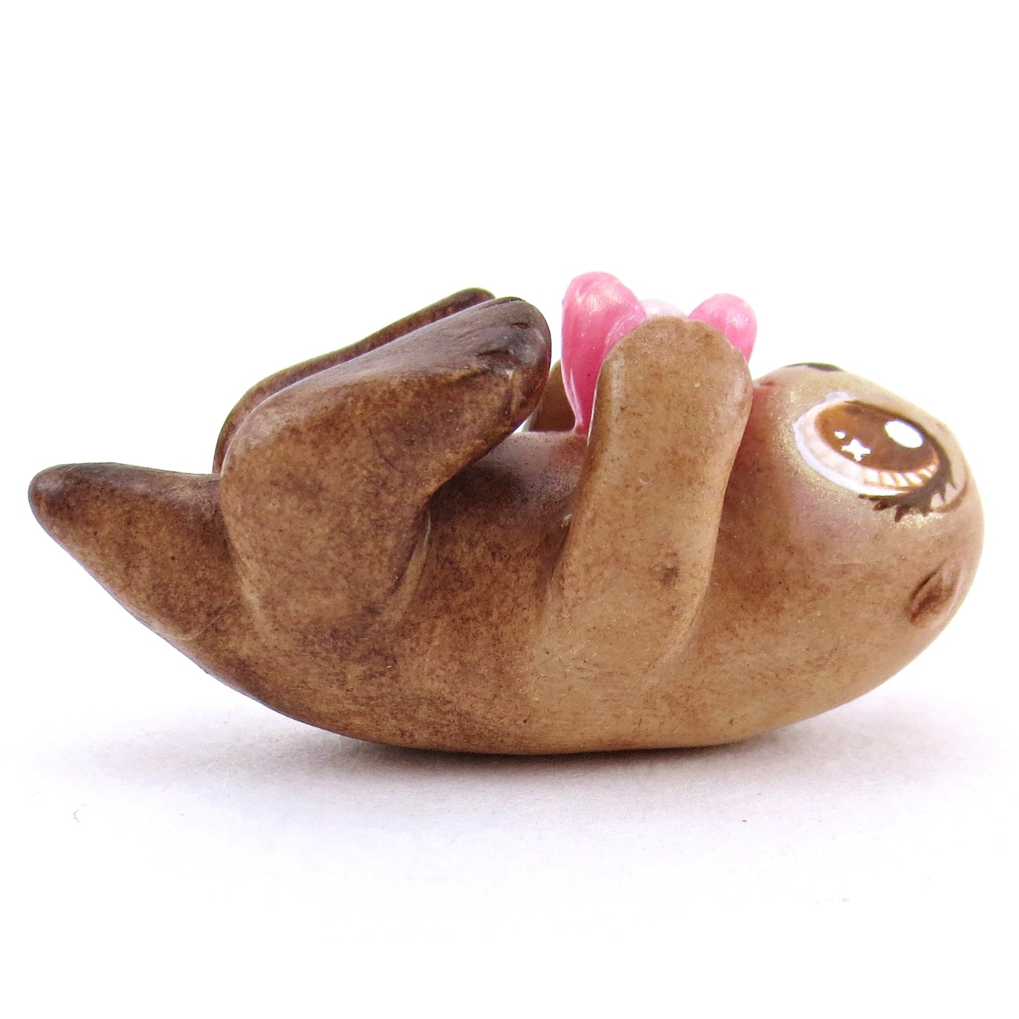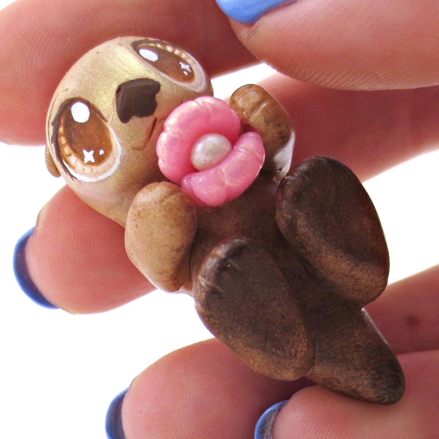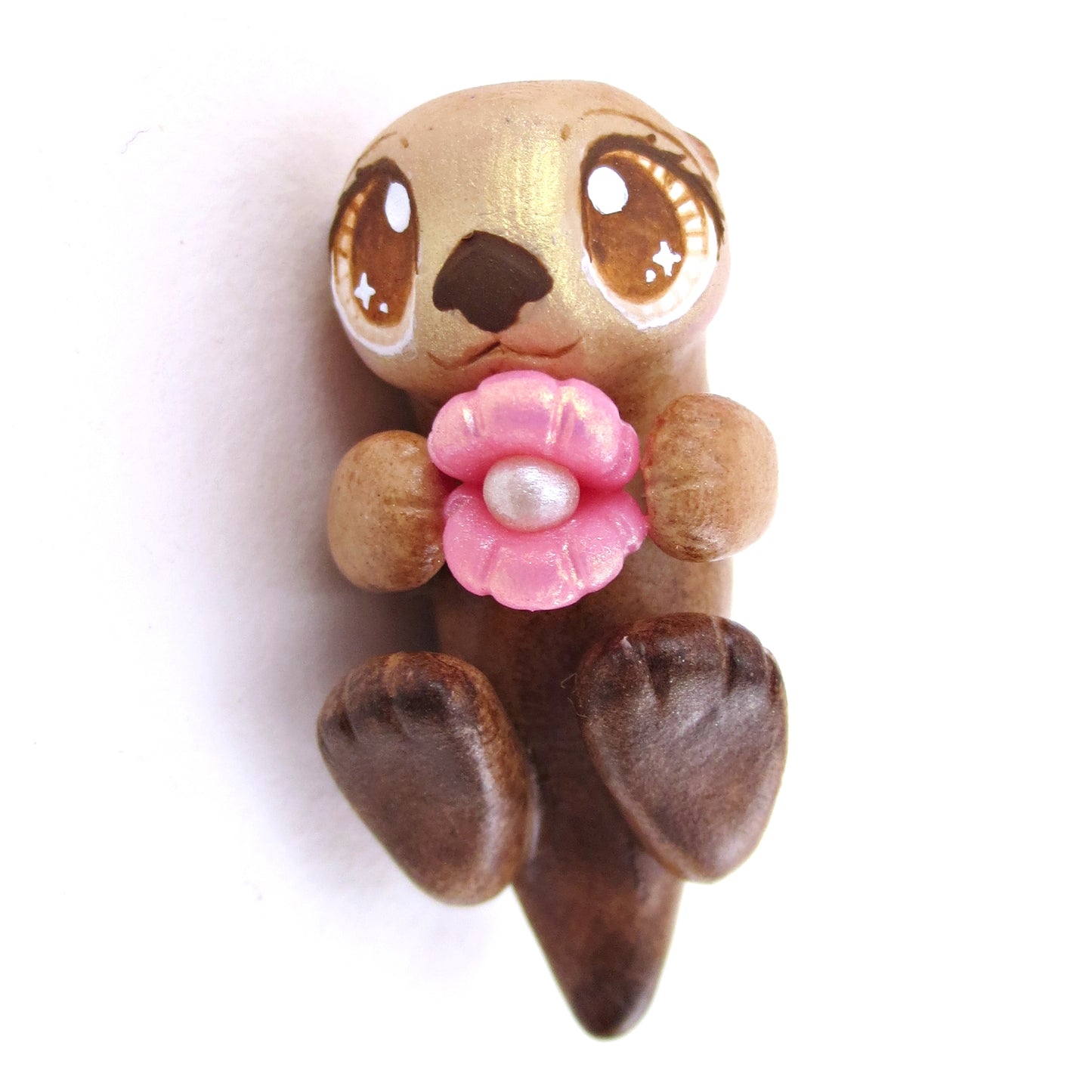 Sea Otter with Pink Seashell Figurine - Polymer Clay Enchanted Ocean Animals